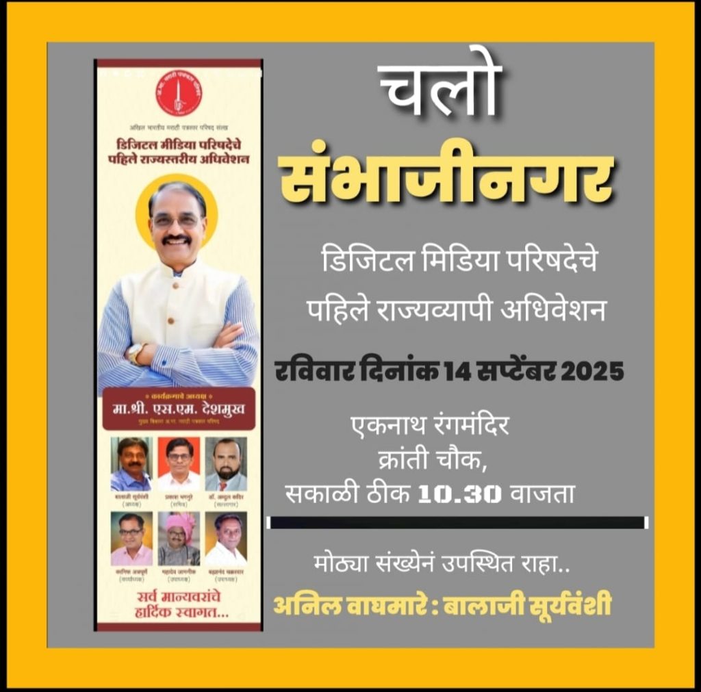 मावळ मराठा न्युज -संभाजीनगर,अखिल भारतीय मराठी पत्रकार परिषदेची एक विंग असलेल्या डिजिटल मिडिया परिषदेचे पहिले राज्यस्तरीय अधिवेशन रविवार दिनांक १४ सप्टेंबर २०२५ रोजी संभाजीनगर येथे होत असून अधिवेशनास एक हजार पत्रकार उपस्थित राहतील असा विश्वास एस.एम.देशमुख यांनी व्यक्त केला आहे.डिजिटल मिडियातील पत्रकारांची संख्या उत्तरोत्तर वाढत असून त्यांना संघटीत करून त्यांच्या प्रश्नांच्या सोडवणुकीबाबत अधिवेशनात विचार विनिमय करून ठोस भूमिका घेतली जाणार आहे.क्रांती चौक परिसरातील एकनाथ रंगमंदिर येथे पालकमंत्री संजय शिरसाट आणि कँबिनेट मंत्री अतुलजी सावे यांच्या हस्ते अधिवेशनाचे उद्घाटन होणार असून एस.एम.देशमुख अधिवेशनाच्या अध्यक्षस्थानी असतील.