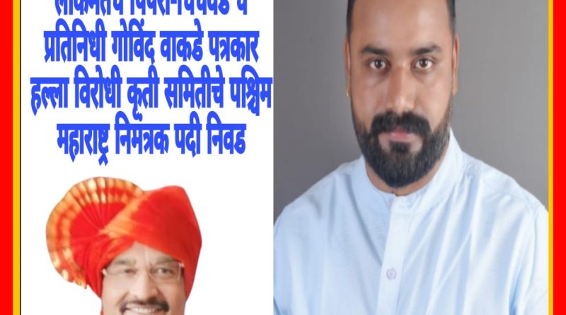 मावळ मराठा न्यूज:-मुंबई,लोकमतचे पिंपरी-चिंचवड चे प्रतिनिधी गोविंद वाकडे यांची पत्रकार हल्ला विरोधी कृती समितीचे पश्चिम महाराष्ट्र निमंत्रक म्हणून नियुक्ती करण्यात आली आहे..राज्य निमंत्रक एस.एम देशमुख यांनी आज येथे घोषणा केली.. पुढील दोन वर्षांसाठी ही नियुक्ती असेल.गोविंद वाकडे गेली पंधरा वर्षे पत्रकारितेत आहेत.. मुळचे यवतमाळ जिल्ह्य़ातील उमरखेडचे रहिवासी असलेले वाकडे अगोदर न्यूज १८ लोकमतचे वाशिम जिल्हा प्रतिनिधी होते,नंतर पुणे प्रतिनिधी म्हणून आणि गेली दहा वर्षे पिंपरी चिंचवडचे प्रतिनिधी म्हणून ते कार्यरत आहेत.गोविंद वाकडे याच्या नियुक्तीबद्दल मराठी पत्रकार परिषदेचे विश्वस्त किरण नाईक, अध्यक्ष शरद पाबळे आणि विभागीय सचिव अरूण तथा नाना कांबळे यांनी त्यांचे अभिनंदन केले आहे.