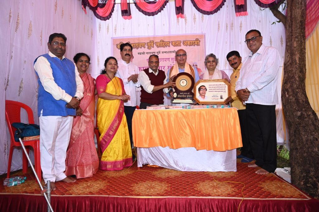 मावळ मराठा न्युज -पिंपरी, (प्रदीप गांधलीकर) दिनांक : १६ ऑक्टोबर २०२५ ‘कविवर्य नारायण सुर्वे हे मानवतावादी कवी होते!’ असे विचार ८९ व्या अखिल भारतीय मराठी साहित्य संमेलनाचे अध्यक्ष डॉ. श्रीपाल सबनीस यांनी नारायण सुर्वे यांचे निवासस्थान, स्वानंद सोसायटी, नेरळ येथे बुधवार, दिनांक १५ ऑक्टोबर २०२५ रोजी व्यक्त केले. नारायण सुर्वे साहित्य कला अकादमी आयोजित पद्मश्री नारायण सुर्वे जन्मशताब्दी सोहळ्यातील काव्यजागर आणि पुरस्कार प्रदान समारंभात डॉ. श्रीपाल सबनीस बोलत होते. श्रमश्री बाजीराव सातपुते अध्यक्षस्थानी होते; तसेच पद्मश्री नारायण सुर्वे साहित्य कला अकादमीचे अध्यक्ष सुदाम भोरे, सचिव पुरुषोत्तम सदाफुले यांची व्यासपीठावर प्रमुख उपस्थिती होती. याप्रसंगी ९१व्या अखिल भारतीय मराठी साहित्य संमेलनाचे अध्यक्ष लक्ष्मीकांत देशमुख यांना पद्मश्री नारायण सुर्वे जीवनगौरव सन्मान, महाराष्ट्र साहित्य परिषद – पुणे कार्यवाह अंजली कुलकर्णी यांना पद्मश्री नारायण सुर्वे काव्यसाधना पुरस्कार, कर्तव्यदक्ष गृहिणी सुनंदा दिगंबर ढोकले यांना मास्तरांची सावली सन्मान आणि कवी दत्तात्रय खंडाळे यांना पद्मश्री नारायण सुर्वे जन्मशताब्दी पुरस्कार प्रदान करून गौरविण्यात आले. त्याचबरोबर सागर जाधव (‘माती मागतेय पेनकिलर’) , राजेंद्र वाघ (‘श्रमिकांचं गोंदण’), वंदना इन्नाणी (‘मन आभाळ आभाळ’) या कवींच्या कवितासंग्रहांना नारायण सुर्वे साहित्य पुरस्कार प्रदान करून सन्मानित करण्यात आले. यावेळी नारायण सुर्वे यांचे वारसदार कवी म्हणून निवड करण्यात आलेल्या संगीता झिंजुरके, मानसी चिटणीस, जयश्री श्रीखंडे, प्रभाकर वाघोले, कुमार खोंद्रे या कवींसह पुरस्कारप्राप्त कवींनी नारायण सुर्वे यांच्या वैविध्यपूर्ण कवितांचे प्रभावी सादरीकरण करीत काव्यजागर केला.डॉ. श्रीपाल सबनीस पुढे म्हणाले की, ‘केशवसुत ते नामदेव ढसाळ व्हाया नारायण सुर्वे हा आधुनिक मराठी कवितेचा प्रवास आहे. मार्क्स, गांधी, आंबेडकर यांच्या विचारांचा सार असलेल्या सुर्वे यांच्या कवितेचा पट रस्ता ते विद्यापीठ इतका व्यापक आहे. त्यांची कविता सत्याचा अन् श्रमिकांच्या घामाचा जागर करणारी असून विश्वसंस्कृती हा तिचा गाभा आहे. सुर्वे यांचा वैचारिक वारसा लक्ष्मीकांत देशमुख यांच्या लेखनातून प्रतीत होतो. अभिजन आणि बहुजन एकत्र येऊन एका कवीच्या जन्मशताब्दीनिमित्त त्याच्या कवितांचा काव्यजागर करतात, ही साहित्यातील अपूर्वाईची बाब आहे!’ सुदाम भोरे यांनी प्रास्ताविकातून, नारायण सुर्वे यांच्या जन्मशताब्दीनिमित्त नारायण सुर्वे साहित्य कला अकादमीच्या वतीने संपूर्ण वर्षभर वेगवेगळ्या ठिकाणी विविध कार्यक्रमांचे आयोजन करण्यात ये