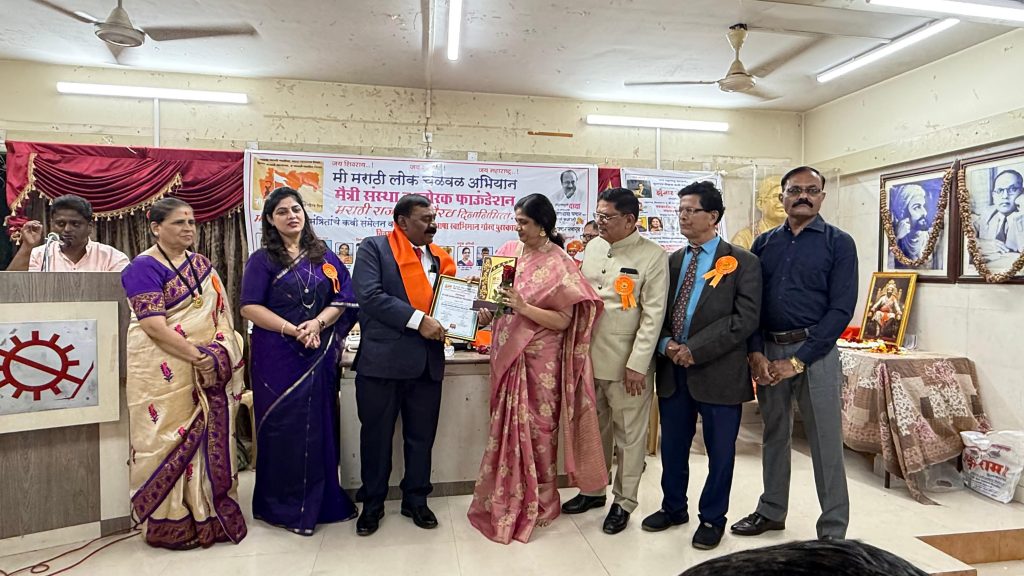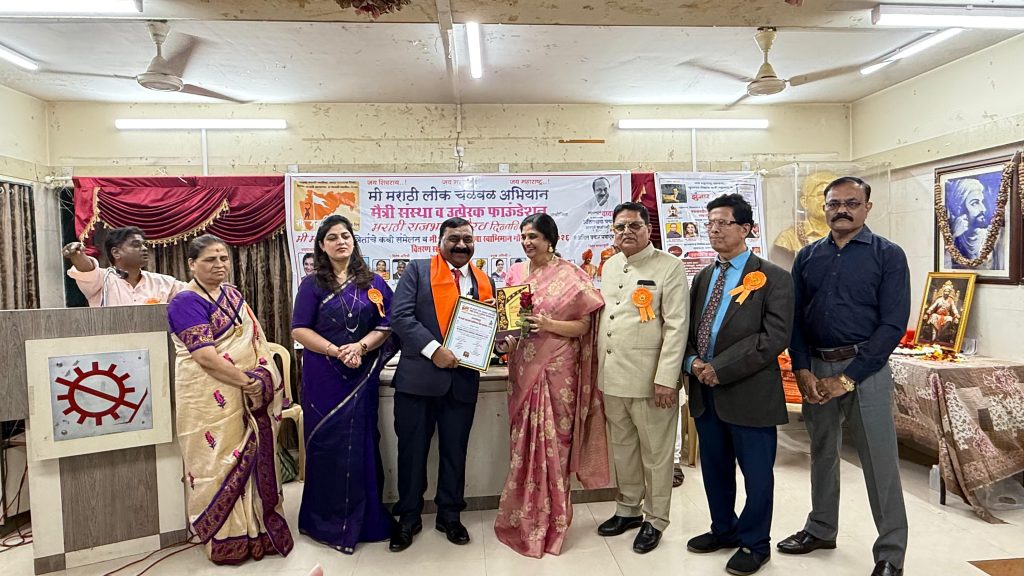 मावळ मराठा न्युज- मुंबई-दि.०१.०३.२०२६ मुंबई येथे बाळ दंडवते सभागृह , म्युनिसिपल मजदुर इमारत , बावला मस्जिद समोर , महाराष्ट्र हायस्कूल मैदान , करीरोड येथे मी मराठी लोक चळवळ अभियान , मैत्री संस्था व उत्प्रेरक फाऊँडेशन आयोजीत मराठी राजभाषा गौरव दिनानिमित्त मी मराठी निमंत्रितांचे कवी संमेलन यांच्या संयुक्त विद्यमाने नुकत्याच झालेल्या कार्यक्रमा मध्ये समाजामध्ये धार्मिक , क्रिडा , सांस्कृतिक , पत्रकारिता , राजकिय , पर्यावरण , साहित्यिक , उद्योग , सहकार , शैक्षणिक , आरोग्यविषयक , कृषी , दिव्यांग कार्य , संशोधन , विज्ञान , तंत्रज्ञान , अशा अनेक विविध सामाजिक उत्कृष्ट व उल्लेखनिय कार्य म्हणून सामाजिक सेवेतील अष्टपैलु व्यक्तीमत्व असणारे कासारवाडीचे सुपुत्र पैलवान काळुराम लांडगे यांना संस्थेच्या वतीने ” मी मराठी राजभाषा स्वाभिमान गौरव पुरस्कार २०२६ ” सन्मानचिन्ह , सन्मानपत्र , शाल कार्यक्रमाचे प्रमुख पाहुणे मातृतिर्थ शिंदखेडराजा राजे लखोजी जाधवराव यांचे १४ वे वंशज आणि राजमाता माॅ साहेब जिजाऊ यांचे थेट १४ वे वंशज मा. संभाजीराव राजे जाधवराव , प्रसिद्ध अभिनेत्री , व प्रवर्तक मराठी शाळा वाचवा अभियान मा. चिन्मयी सुमित , कै.शिवाजीराव देशमुख सामाजिक व शैक्षणिक संस्थेचे संस्थापक व अध्यक्षा मा. चारुशिला देशमुख यांच्या शुभहस्ते पुरस्कार बहाल करण्यात आला.यावेळी फिल्म सँसॉर भारत बोर्डाचे मा.सदस्य मा.विलास खानोलकर , उत्प्रेरक फाऊंडेशनचे अध्यक्ष डॉ.संतोष काबळे , आदर्श शिक्षिका मा.स्पृहा सुरेश इंदु , जेष्ठ शिक्षण तज्ञ मा.मंगला परब उपस्थित होते.कार्यक्रम संपुर्ण पारपाडण्यासाठी मैत्री संस्थेचे अध्यक्ष मा.सुरज भोईर व त्याच्या संपुर्ण टीमने भरपुर प्रयत्न केलेकार्यक्रमाला , पुरस्कार्थी , कवी व त्याच्या नातेवाईक व नागरिकांनी भरपुर गर्दी केली होती.