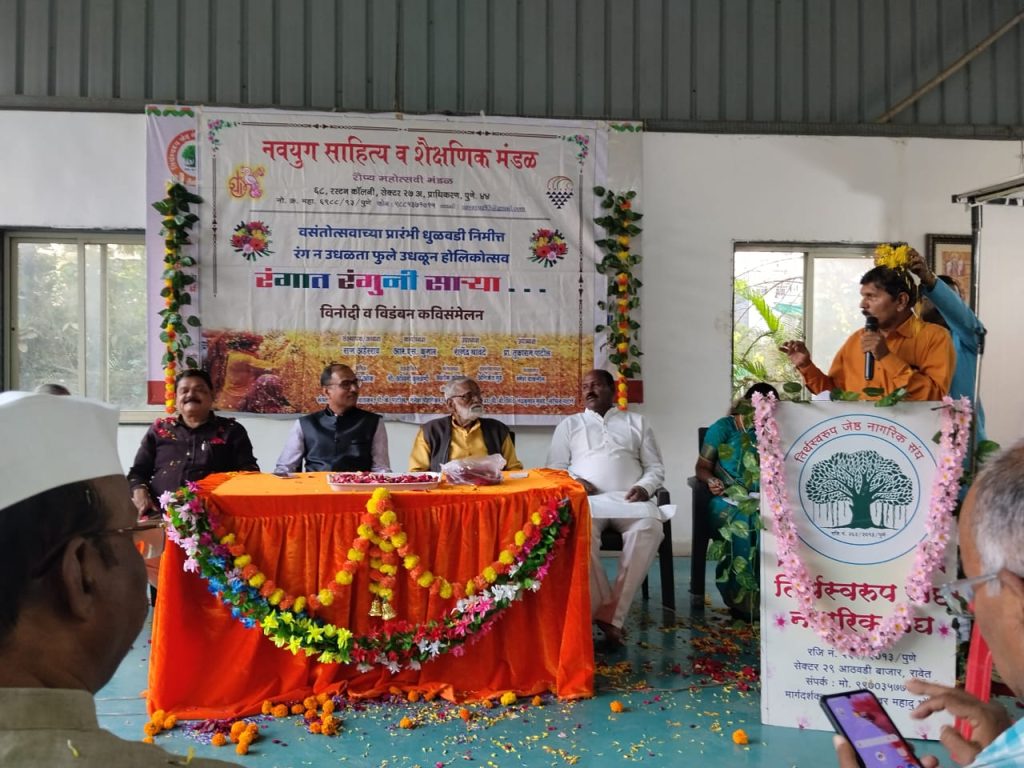 मावळ मराठा न्युज-पिंपरी (प्रदीप गांधलीकर) दिनांक : ०४ मार्च २०२६ ‘जीवनात हास्यविनोद खूप महत्त्वाचा असतो. तो आपले दुःख दूर करीत नसला तरी सुसह्य नक्कीच करतो!’ असे विचार प्रसिद्ध हास्यकवी भालचंद्र कोळपकर यांनी मंगळवार, दिनांक ०३ मार्च २०२६ रोजी तीर्थस्वरूप ज्येष्ठ नागरिक संघ, पेठ क्रमांक २९, रावेत येथे नवयुग साहित्य व शैक्षणिक मंडळ आणि तीर्थस्वरूप ज्येष्ठ नागरिक संघ यांच्या संयुक्त विद्यमाने होलिकात्सव आणि धूलिवंदनाचे औचित्य साधून आयोजित केलेल्या ‘रंगात रंगुनी सार्या…’ या विनोदी, विडंबन कविसंमेलनात अध्यक्षीय मनोगतातून व्यक्त केले. याप्रसंगी पिंपरी – चिंचवड महापालिका विरोधी पक्षनेते भाऊसाहेब भोईर, ज्येष्ठ साहित्यिक आणि कामगारनेते अरुण बोऱ्हाडे, नवयुगचे अध्यक्ष राज अहेरराव, उपाध्यक्ष प्रा. तुकाराम पाटील, उपाध्यक्ष राजेंद्र घावटे, सचिव माधुरी ओक, तीर्थस्वरूप ज्येष्ठ नागरिक संघाचे सचिव शिरीष कुंभार यांची प्रमुख उपस्थिती होती.यावेळी पिंपरी – चिंचवड महानगरपालिकेतविरोधी पक्षनेतेपदी निवड झाल्याप्रीत्यर्थ नवयुगच्या वतीने आणि अरुण बोऱ्हाडे यांच्या हस्ते भाऊसाहेब भोईर यांचा सत्कार करण्यात आला. सत्काराला उत्तर देताना भोईर यांनी, ‘जीवनात खूप आघात सोसले; मात्र कला आणि साहित्य क्षेत्राने मला जगायला शिकवले. आता पालिकेच्या माध्यमातून शहरातील साहित्यिक अन् कलाकार यांच्यासाठी खूप काम करायचे आहे!’ अशी ग्वाही दिली. त्यापूर्वी राज अहेरराव यांनी, ‘गेली नऊ वर्षे आर्थिकदृष्ट्या दुर्बल साहित्यिकांची १०० पुस्तके पिंपरी – चिंचवड महापालिकेने विकत घ्यावी किंवा त्यांच्या पुस्तक प्रकाशनासाठी रुपये १५०००/- (रुपये पंधरा हजार) सानुग्रह अनुदान देण्यात यावे, ही मागणी करत आलो आहोत. या वेळी ही मागणी पूर्ण होईल ही आशा आहे!’ अशी भूमिका मनोगतातून मांडली. राजेंद्र घावटे यांनी प्रास्ताविकातून चौतीस वर्षांपासून कार्यरत असलेल्या नवयुग साहित्य व शैक्षणिक मंडळाच्या विविध उपक्रमांची माहिती दिली.’रंगात रंगुनी सार्या…’ या कविसंमेलनात रेणुका हजारे, नेहा जाधवराव, अरुण अहिवळे, जयश्री श्रीखंडे, नीला चित्रे, दिगंबर दिवाण, सुखदा टंकसाळे, सुधाकर सोनार, मोहन उमरीकर, देवेंद्र गावंडे, योगिता कोठेकर, ज्ञानेश्वर मोरे, प्रतिमा काळे, चंद्रकांत धस, सुरेश कंक, अरुण कांबळे, उमेंद्र बिसेन, नंदकुमार कांबळे, अशोक टाकळे, प्रकाश चव्हाण, डाॅ. श्रीकृष्ण जोशी, राधाबाई वाघमारे, सुहास घुमरे, प्रदीप गांधलीकर, जितेंद्र राय यांनी स्वरचित विनोदी आणि विडंबन कवितांचे प्रभावी सादरीकरण करीतउपस्थितांना हास्यरंगात भिजवून चिंब केले; तर संगीता सलवाजी आणि सविता इंगळे यांच्या कवितांचे सुप्रिया लिमये आणि 