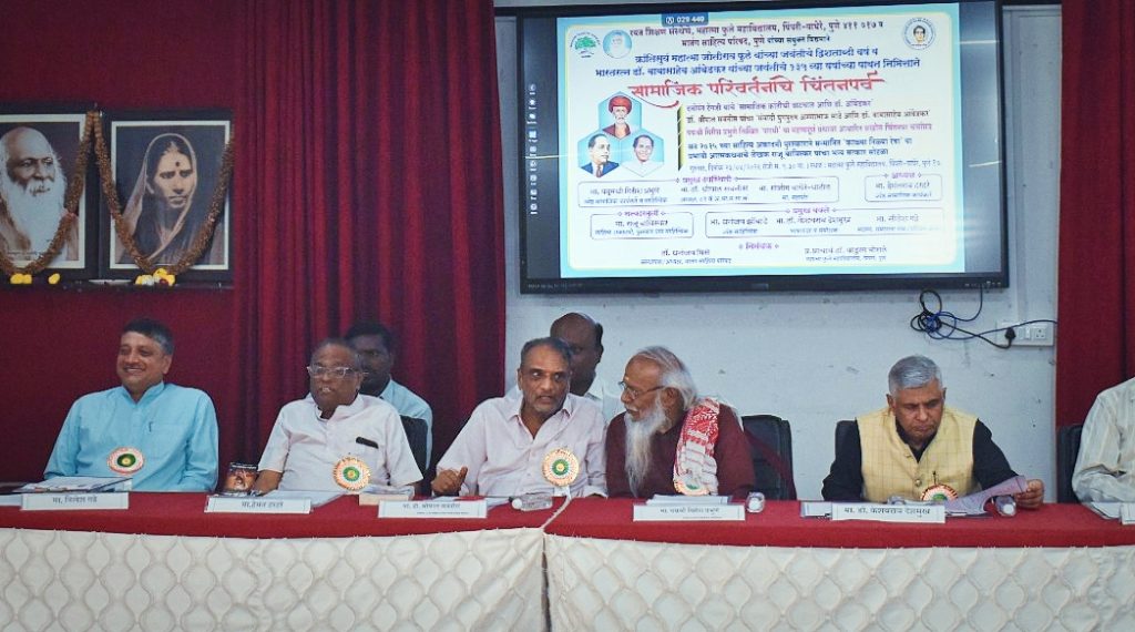 मावळ मराठा न्युज -पिंपरी-चिंचवड : “ खरे सामाजिक परिवर्तन घडवायचे असेल तर तरुणांनी समाजात उतरून बंधुता, समरसता आणि राष्ट्रकार्याची जाणीव जोपासली पाहिजे. व्यक्ती आणि समाजविकास परस्परावलंबी असल्याने युवक परिवर्तनाचा केंद्रबिंदू आहे. पारधी यासारख्या ग्रंथाचा विद्यापीठाच्या अभ्यासक्रमात समावेश करून भटक्या-विमुक्तांच्या प्रश्नांची जाणीव निर्माण व्हावी, तसेच पोलीस प्रशिक्षणात संवेदनशीलतेचे धडे आणि समाज-पोलीस संवाद वाढला पाहिजे. डॉ. आंबेडकरांची “शिका, संघटित व्हा, संघर्ष करा” ही त्रिसूत्री आजही मार्गदर्शक असून मात्र, संघर्षाचा अर्थ केवळ आंदोलन नसून तो विचारांचा, मूल्यांचा आणि नैतिकतेचा संघर्ष आहे. परिवर्तनाची सुरुवात स्वतःपासूनच झाली पाहिजे.” असे प्रतिपादन श्री हेमंतराव हरहरे मातंग साहित्य परिषद, पुणे आणि रयत शिक्षण संस्थेचे महात्मा फुले महाविद्यालय, पिंपरी-वाघेरे यांच्या संयुक्त विद्यमाने क्रांतीसूर्य महात्मा ज्योतिराव फुले यांच्या जयंती द्विशताब्दी वर्षानिमित्त तसेच भारतरत्न डॉ. बाबासाहेब आंबेडकर यांच्या १३५ व्या जयंतीनिमित्त आयोजित केलेल्या “सामाजिक परिवर्तनाचे चिंतनपर्व ह्या विशेष चर्चासत्राच्या संपन्न झालेल्या अध्यक्षस्थानावरुन केले. या प्रसंगी पद्मश्री गिरीश प्रभुणे, डॉ. श्रीपाल सबनीस,माजी महापौर संजोग वाघेरे-पाटील,साहित्य अकादमी पुरस्कार प्राप्त लेखक राजू बाविस्कर,प्रा. डॉ.केशवराव देशमुख,श्री निलेश गद्रे, श्री धनंजय झोंबाडे ,कृष्णा बंडलकर , प्राचार्य, डॉ. पांडुरंग भोसले, डॉ. धनंजय भिसे,सुरेश पाटोळे,विलास लांडगे,संदिपान झोंबाडे,अँड.क्षितिज गायकवाड,प्रदीप पवार, धनंजय खुडे, सोपानराव कुलकर्णी,अनय मुळे,समीर पाचारणे ,डॉ.संतोष रोडे,प्रा.निळकंट डहाळे,प्रा.संग्राम गोसावी इत्यादींची प्रमुख उपस्थिती लाभली होती.हरहरे पुढे डॉ.श्रीपाल सबनीस यांचा संदर्भ देत म्हणाले की “ डॉ.श्रीपाल सबनीस यांनी आपल्या भाषणात ‘चातुर्वर्ण्य’ या संकल्पनेचा संदर्भ देत श्री गोळवलकर गुरुजी यांच्या विचारांशी असहमती व्यक्त केली. त्यांनी महापुरुषांच्या ‘सामर्थ्य’ आणि ‘मर्यादा’ या दोन शब्दांच्या माध्यमातून आपल्या भूमिकेची मांडणी करत, “सत्याची बाजू मी नेहमी मांडत राहीन,” असे ठामपणे सांगितले.यावर पुढे प्रत्युत्तर देताना गिरीश प्रभुणे यांनी याचे ठोस दाखले देत परमपूज्य श्री गुरुजी यांनी कधीही ‘चातुर्वर्ण्य’ व्यवस्थेचा पुरस्कार केलेला नाही असा प्रतिवाद मांडला जात असताना विशेष म्हणजे डॉ. सबनीस उपस्थित नव्हते.”तर पद्मश्री गिरीश प्रभुणे म्हणाले ,“पारधी या पुस्तकातून व्यक्त झालेला समाज मी केवळ दोन-चार टक्केच शब्दबद्ध करू शकलो आहे; कारण त्यांच्या व