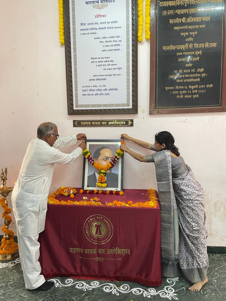 मावळ मराठा न्यूज:- वडगाव,डॉ बाबासाहेब आंबेडकर यांच्या प्रतिमेचे पूजन वडगाव मावळ न्यायालयाचे मुख्य न्यायाधीश उम्रेडकर आणि जेष्ठ विधिज्ञ गाडे यांचे हस्ते करून बाबासाहेब आंबेडकर यांना अभिवादन करण्यात आले .यावेळी न्यायाधीश श्री अगरवाल तसेच कातकर, बर्गे, पाटील तसेच वडगाव मावळ वकील बार असोसिएशन चे विद्यमान अध्यक्ष संजय वांद्रे यांचे संकल्पनेने भारतीय संविधान उद्देशिका मुख्य प्रवेशद्वार समोर लावून भीमजयंती ची सुरवात करण्यात आली. डॉ बाबासाहेब आंबेडकर जयंती महोत्सव कमिटी यांचे वतीने वडगाव मावळ न्यायालयाचे ग्रंथालयास पुस्तके भेट देण्यात आली. या करिता ॲड अमित गायकवाड ॲड अभय पळनिटकर ॲड मिलिंद ओव्हाळ ॲड सुरज देसाई ॲड राजेश देसाई ॲड अमोल पी देसाई ॲड अमोल देसाई ॲड सुरेश गावडे ॲड योगेश गायकवाड ॲड आशिष जाधव यांनी विशेष सहकार्य केले व पुस्तकांसारखे मित्र उपलब्ध केले व सर्व न्यायाधीश यांस भारतीय संविधान भेट देऊन संविधान आणि डॉ बाबासाहेब आंबडेकर यांचे प्रति कृज्ञता व्यक्त केली.