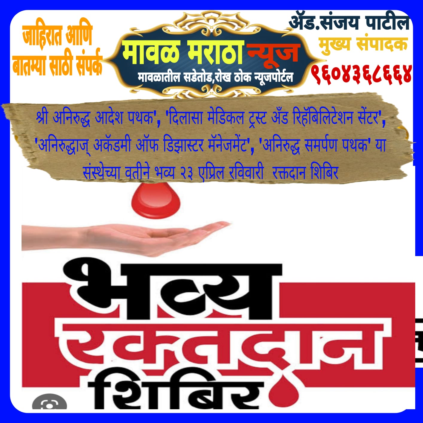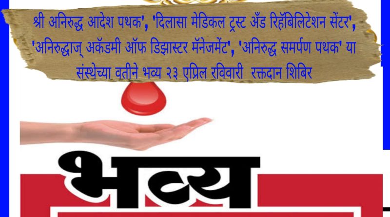 श्री अनिरुद्ध आदेश पथक’, ‘दिलासा मेडिकल ट्रस्ट अँड रिहॅबिलिटेशन सेंटर’, ‘अनिरुद्धाज् अकॅडमी ऑफ डिझास्टर मॅनेजमेंट’, ‘अनिरुद्ध समर्पण पथक’ या संस्थेच्या वतीने भव्य २३ एप्रिल रविवारी रक्तदान शिबिर