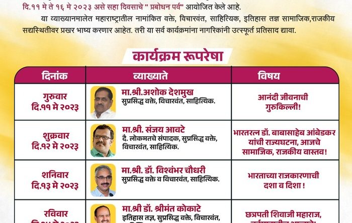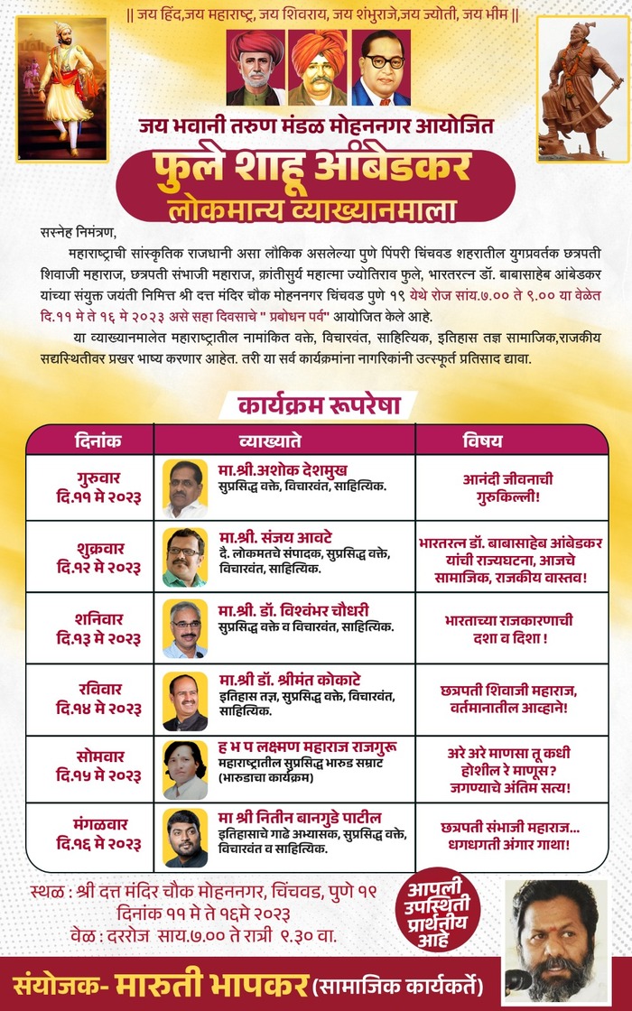 मावळ मराठा न्यूज:-पिंपरी (प्रदीप गांधलीकर)दिनांक : ०९ मे २०२३ जयभवानी तरुण मंडळ, मोहननगर आयोजित सहा दिवसीय फुले – शाहू – आंबेडकर लोकमान्य व्याख्यानमाला गुरुवार, दिनांक ११ मे ते मंगळवार, दिनांक १६ मे २०२३ या कालावधीत आयोजित करण्यात आली आहे. श्री दत्त मंदिर चौक, मोहननगर, चिंचवड येथे दररोज सायंकाळी ७:०० ते ९:०० या वेळेत खालीलप्रमाणे व्याख्यानांचे आयोजन करण्यात आले आहे.गुरुवार, दिनांक ११ मे रोजी सुप्रसिद्ध वक्ते अशोक देशमुख ‘आनंदी जीवनाची गुरूकिल्ली’ या विषयावरील प्रथम पुष्प गुंफतील. शुक्रवार, दिनांक १२ मे रोजी ज्येष्ठ पत्रकार संजय आवटे ‘भारतरत्न डॉ. बाबासाहेब आंबेडकर यांची राज्यघटना : आजचे सामाजिक, राजकीय वास्तव!’ या विषयावर विचार मांडतील. शनिवार, दिनांक १३ मे रोजी सुप्रसिद्ध विचारवंत डॉ. विश्वंभर चौधरी ‘भारताच्या राजकारणाची दशा व दिशा’ या विषयाच्या माध्यमातून तृतीय पुष्पाची गुंफण करतील. रविवार, दिनांक १४ मे रोजी इतिहासतज्ज्ञ डॉ. श्रीमंत कोकाटे छत्रपती शिवाजीमहाराज : वर्तमानातील आव्हाने!’ या विषयावर चतुर्थ पुष्प गुंफणार आहेत. सोमवार, दिनांक १५ मे रोजी ह. भ. प. लक्ष्मणमहाराज राजगुरू ‘अरे अरे माणसा तू कधी होशील रे माणूस?’ या विषयावर भारुडांच्या माध्यमातून ‘जगण्याचे अंतिम सत्य!’ मांडतील. व्याख्यानमालेतील अंतिम पुष्प मंगळवार, दिनांक १६ मे रोजी सुप्रसिद्ध वक्ते नितीन बानगुडे – पाटील ‘छत्रपती संभाजीमहाराज : धगधगती अंगारगाथा’ या विषयाने गुंफणार आहेत.विनाशुल्क असलेल्या या सर्व व्याख्यानांचा लाभ सर्व नागरिकांनी आवर्जून घ्यावा, असे आवाहन सामाजिक कार्यकर्ते मारुती भापकर यांनी केले आहे.
