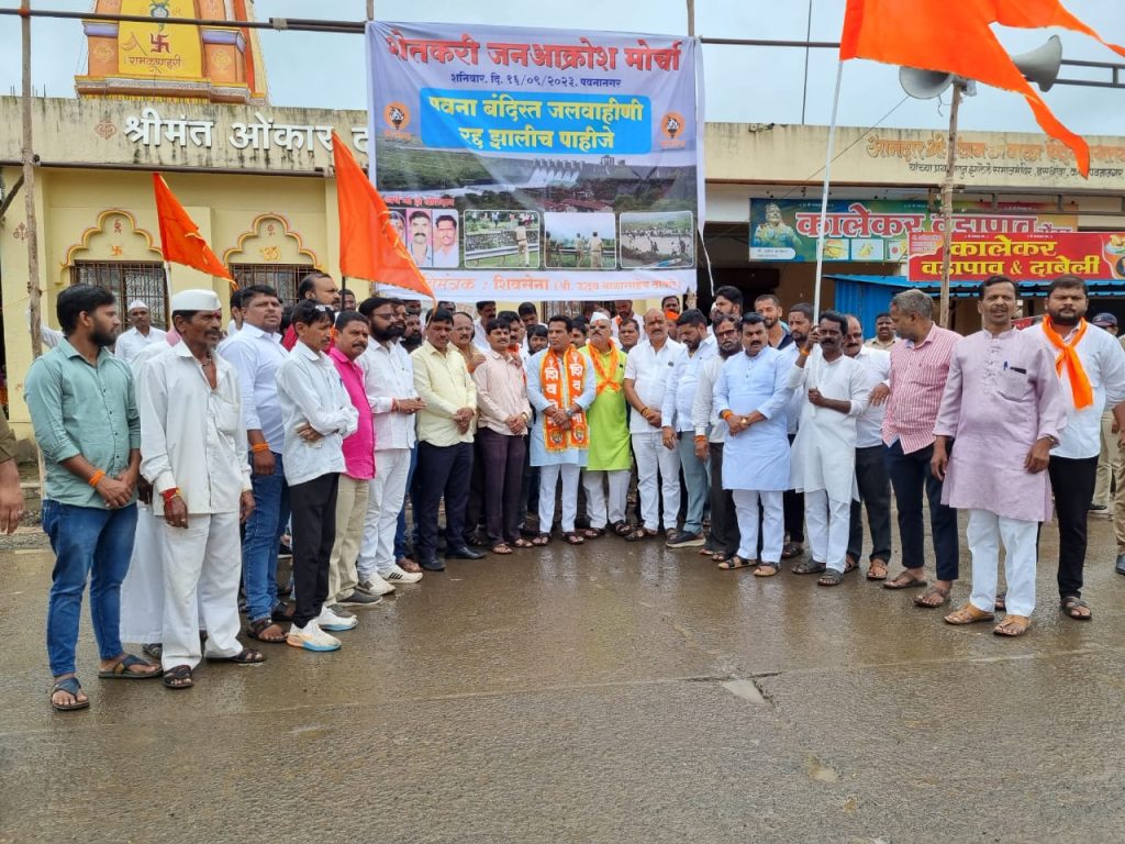 मावळ मराठा न्यूज़ ,पवननगर , पाणी आमच्या हक्काचं नाही कोणाच्या बापाच अश्या राज्य सरकार च्या विरोधात घोषणा देत आज पवना नगर मधे बाजारपेठ येथे शेतकरी जन आक्रोश मोर्चा काढण्यात आला. स्थानिक अनेक संघटना यांनी यात सहभाग घेतला ही स्थगिती ऊठुन सरकारने शेतकऱ्यांच्या जखमेवर मीठ चोळले आहे ,त्यांची फसवणूक केली आहे, भाजप , राष्ट्रवादी काँग्रेस ला आंदोलन घेण्याच्या नैतिक अधिकार नाही,त्यांनी आधी राजीनामे देऊन शेतकऱ्यांसोबत रस्त्यावर यायला हवे , जर लवकरात लवकर ही स्थगिती घेतली गेली नाही तर शिवसेना उद्धव बाळासाहेब ठाकरे पक्ष आपल्या स्टाईल ने आंदोलन करेल असा इशारा देण्यात आला, आमदार माजी आमदार यांनी शेतकऱ्यांचा विश्वास घात केला आहे , पिंपरी चिंचवड मध्ये आनंदाचं वातावरण आहे तर मावळातील शेतकरी उध्वस्त होतोय म्हणून दुःखात आहे ,अजून किती बळी घेणार असा सवाल शेतकरी करीत आहे,अनेक जणांनी यावेळी आपले मनोगत व्यक्त केले प्रशासन अधिकारी अप्पर तहसीलदार यांनी निवेदन स्वीकारले तसेच शिवसेना उद्धव बाळासाहेब ठाकरे पक्षा च आंदोलन असल्या मुळे मोठ्या संख्येने पोलीस फ़ौज फाटा उपस्थित होता . शिवसेना तालुका प्रमुख आशिष ठोंबरे यांनी यापुढील आंदोलन पक्षा च्या मार्फत घेतले जाईल असे जाहीर केलेसर्व पदाधिकारी,शिवसैनिक,शेतकरी संघटना उपस्थित होते .