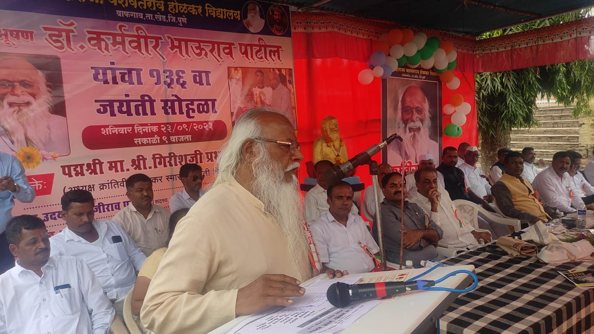 मावळ मराठा न्यूज़ :- पिंपरी (प्रदीप गांधलीकर) दिनांक : २४ सप्टेंबर २०२३ “रयत शिक्षण संस्थेमध्ये शिकलेले आणि शिकविणारे या सर्वांचे एकच गोत्र म्हणजे कर्मवीर भाऊराव पाटील!” असे गौरवोद्गार पद्मश्री गिरीश प्रभुणे यांनी वाफगाव (ता. खेड) येथे शनिवार, दिनांक २३ सप्टेंबर २०२३ रोजी काढले. पद्मभूषण डॉक्टर कर्मवीर भाऊराव पाटील यांच्या १३६ व्या जयंतीनिमित्त आयोजित श्रीमंत महाराजा यशवंतराव होळकर विद्यालय वाफगाव, तालुका खेड येथील कार्यक्रमात ज्येष्ठ समाजसेवक पद्मश्री गिरीश प्रभुणे बोलत होते. रयत शिक्षण संस्था, साताराचे जनरल बॉडी सदस्य उदय शिवाजीराव पाटील कार्यक्रमाच्या अध्यक्षस्थानी होते; तसेच वैज्ञानिक डॉ. अशोक नगरकर, माजी विद्यार्थी ॲड. सतिश गोरडे, वाफगावचे सरपंच राजेंद्र टाकळकर, मुख्याध्यापिका जयश्री आसवले, उपायुक्त सुभाष इंगळे, प्रा. दिगंबर ढोकले, राजेंद्र शिंदे, धनंजय भागवत, सुरेश कराळे आदि मान्यवरांची व्यासपीठावर प्रमुख उपस्थिती होती.कार्यक्रमापूर्वी, वाफगाव येथील रयत शिक्षण संस्थेच्या महाराजा यशवंतराव होळकर विद्यालयाच्या परिसरात मान्यवरांची बैलगाडीमधून उत्साही वातावरणात मिरवणूक काढण्यात आली. त्यानंतरच्या कार्यक्रमात विद्यार्थ्यांना संबोधित करताना गिरीश प्रभुणे यांनी अनेक दाखले देत भारताच्या गौरवशाली इतिहासाच्या परंपरांचा उल्लेख केला. याप्रसंगी ॲड. सतिश गोरडे यांनी आपल्या शाळेतील आठवणी सांगत असतानाच आपण येथूनच घडलो, असे प्रांजळपणे कबूल केले. वडील नानासाहेब गोरडे सर यांच्या शैक्षणिक क्षेत्रातील कार्यामुळे या शाळेत अनेक जण घडले असेही त्यांनी सांगितले. टेमकर यांनी कर्मवीर भाऊराव पाटील यांचा जीवनपट कथन करीत त्यांच्या कार्याची सविस्तर माहिती दिली. शाळेतील विद्यार्थिनींची प्रातिनिधिक मनोगते झालीत. ज्येष्ठ वैज्ञानिक डॉ. अशोक नगरकर यांनी आपल्या मार्गदर्शनातून विद्यार्थ्यांना विज्ञान विषयात जिज्ञासा निर्माण होईल अशी माहिती दिली. प्रा.दिगंबर ढोकले यांनीही मनोगत व्यक्त केले. कर्मवीर भाऊराव पाटील व लक्ष्मीबाई पाटील यांच्या प्रतिमाचे पूजन करून कार्यक्रमांची सुरुवात झाली.रयत शिक्षण संस्थेत शिकलेले आणि समाजाच्या विविध क्षेत्रांमध्ये काम करणारे अनेक उच्चपदस्थ अधिकारी या गावात आहेत त्या सर्वांना एकत्र करून विद्यार्थ्यांना योग्य मार्गदर्शन आणि दिशा द्यावी आणि विद्यालयाच्या विकासासाठी प्रयत्न करावेत. रयत शिक्षण संस्थेच्या माध्यमातून विद्यालयाच्या भौतिक सोयी सुविधा विकासासाठी सदैव कटिबद्ध आहोत असे मत रयतच्या जनरल बॉडीचे सदस्य उदयराव पाटील यांनी व्यक्त केले. शिक्षक केशव टेमकर यांनी मनोगत व्यक्त केले. कार्यक्रमासाठी सरपंच