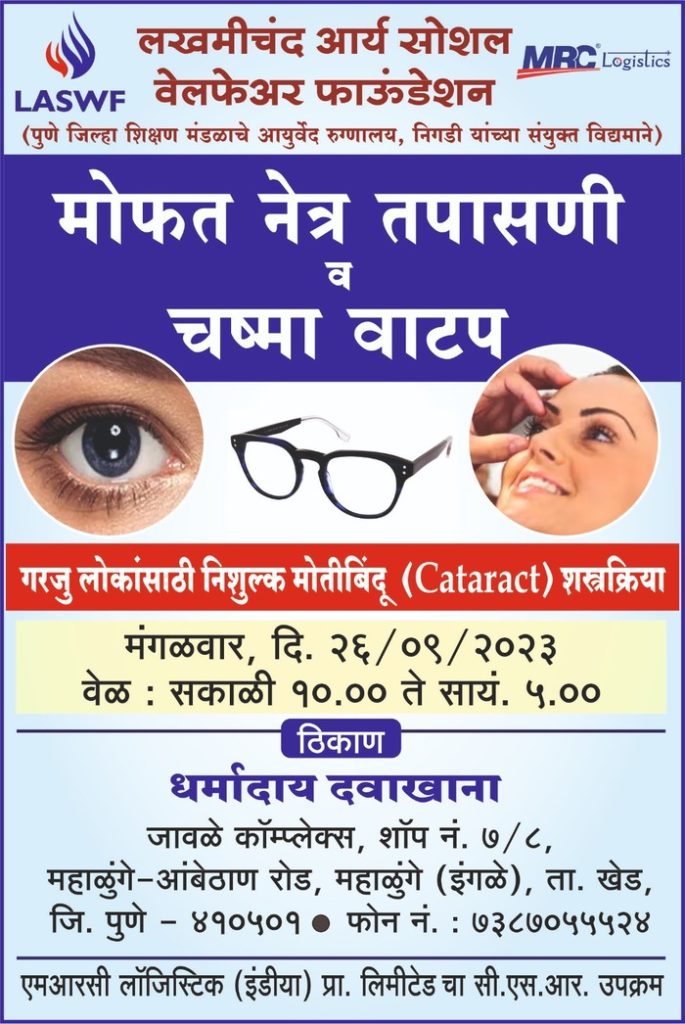 चाकण(प्रतिनिधी) लखमीचंद आर्य सोशल वेलफेअर फौंडेशनच्या वतीने दिनांक २६ सेप्टेम्बर रोजी मोफत नेत्रतपासणी आणि चष्मा वाटप करण्यात येणार आहे.धर्मादाय दवाखाना ,जावळे कॉंप्लेक्स , म्हाळुंगे – आंबेठाण रोड, महाळुंगे(इंगळे) चाकण या ठिकाणी, १० ते ५ या वेळेत होईल.गरजूंनी या शिबिराचा लाभ घ्यावा असे आवाहन केले आहे.