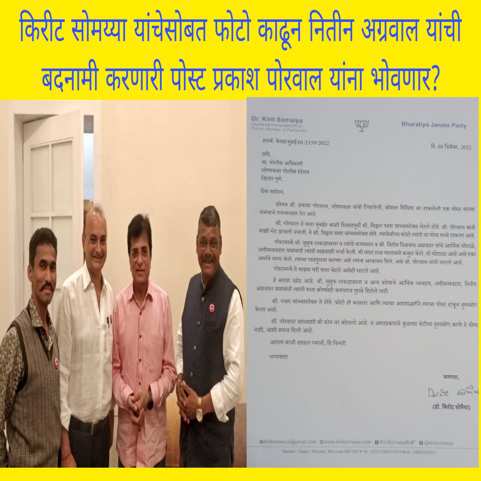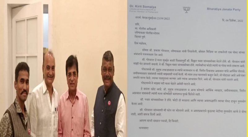 किरीट सोमय्या यांचेसोबत फोटो काढून नितीन अग्रवाल यांची बदनामी करणारी पोस्ट प्रकाश पोरवाल यांना भोवणार?