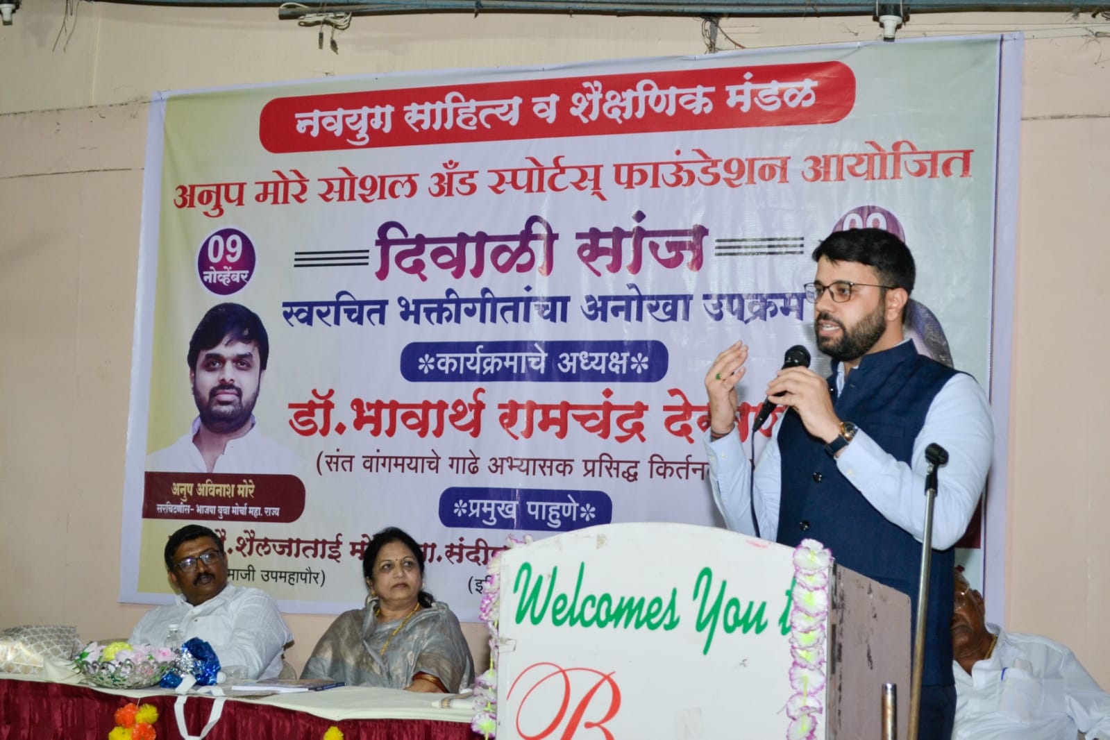 मावळ मराठा न्यूज़ :-पिंपरी, (प्रदीप गांधलीकर) दिनांक : १० नोव्हेंबर २०२३ “कवी हा सत्याचा उपासक असतो. तो आपल्या प्रतिभेने सत्य आणि सौंदर्य एकत्रितपणे मांडू शकतो!” असे विचार संत वाड्.मयाचे अभ्यासक आणि कीर्तनकार डॉ. भावार्थ रामचंद्र देखणे यांनी बीना इंग्लिश मीडियम स्कूल, पांढारकरनगर, आकुर्डी येथे गुरुवार, दिनांक ०९ नोव्हेंबर २०२३ रोजी व्यक्त केले. नवयुग साहित्य व शैक्षणिक मंडळ आणि अनुप मोरे सोशल ॲण्ड स्पोर्ट्स फाउंडेशन यांच्या संयुक्त विद्यमाने आयोजित ‘दिवाळीसांज’ या स्वरचित भक्तिगीतांच्या अनोख्या मैफलीत अध्यक्षीय मनोगत व्यक्त करताना डॉ. भावार्थ देखणे बोलत होते. इतिहास अभ्यासक संदीप तापकीर, माजी उपमहापौर शैलजा मोरे, माजी नगरसेवक आणि ज्येष्ठ साहित्यिक अरुण बोऱ्हाडे, बीना एज्युकेशनल सोसायटीचे सचिव आझमखान, ह. भ. प. भानुदास तापकीर, नवयुग साहित्य व शैक्षणिक मंडळाचे अध्यक्ष राज अहेरराव, कार्याध्यक्ष प्रा. तुकाराम पाटील आदी मान्यवरांची व्यासपीठावर प्रमुख उपस्थिती होती; तसेच साहित्य, संस्कृती आणि सामाजिक क्षेत्रातील अनेक मान्यवरांची सभागृहात उपस्थिती होती.कार्यक्रमाच्या पहिल्या सत्रात मान्यवरांच्या हस्ते ‘दुर्गांच्या देशातून…’ या दिवाळी अंकाचे प्रकाशन करण्यात आले. यावेळी ह. भ. प. भानुदास तापकीर म्हणाले की, “यशाचे गौरीशिखर गाठण्यासाठी परिश्रमाची पराकाष्ठा करावी लागते!” अरुण बोऱ्हाडे यांनी आपल्या मनोगतातून, “गडकिल्ल्यांच्या प्रत्यक्ष अनुभूतीतून सातत्याने बारा वर्षांपासून ‘दुर्गांच्या देशातून…’ हा दिवाळी अंक साकार होतो आहे!” अशी माहिती दिली. डॉ. भावार्थ देखणे पुढे म्हणाले की, “वारसाहक्काने आध्यात्मिक अन् साहित्यिक मिराशी मिळाली, याचा मला सार्थ अभिमान वाटतो. कोकणचा कॅलिफोर्निया अन् महाराष्ट्राचे मिशिगन होताना लोकसंस्कृतीतून महाराष्ट्राची खरी ओळख जगाला होत राहील. त्यामुळे कवींनी ज्ञानवर्धक आणि अविनाशी साहित्याची निर्मिती करावी!” शैलजा मोरे यांनी, “आताच्या काळात वडिलांच्या कार्याचा वारसा चालवणे हे खऱ्या अर्थाने संस्कृतीचे संचित आहे!” असे मत मांडले. सवत्स धेनूची पूजा आणि सर्व उपस्थितांच्या हस्ते प्रत्येकी एक पणती प्रज्वलित करून कार्यक्रमाचा प्रारंभ करण्यात आला. राज अहेरराव यांनी प्रास्ताविकातून, “डॉ. रामचंद्र देखणे आणि रामकृष्ण मोरे यांच्या मार्गदर्शनाखाली तीस वर्षांपूर्वी नवयुग साहित्य व शैक्षणिक मंडळाची स्थापना झाली. पिंपरी – चिंचवड ही श्रमिकांची नगरी असल्याने कामगार साहित्यिकांच्या पुस्तकांसाठी महापालिकेने अर्थसाहाय्य करावे किंवा प्रत्येक प्रकाशित पुस्तकाच्या १०० प्रती खरेदी कराव्यात, यासाठी मंडळ सातत्याने पाठपु