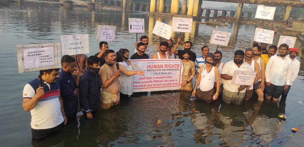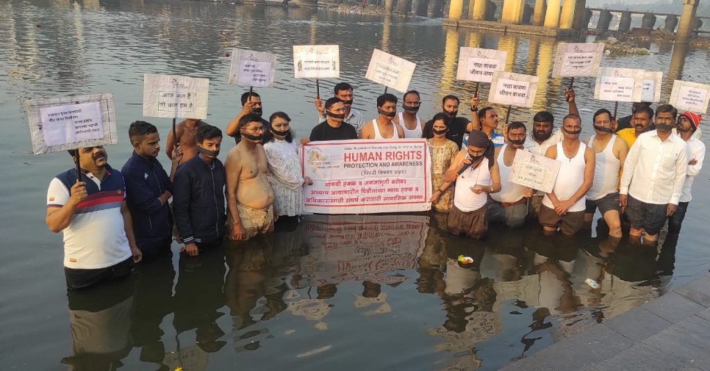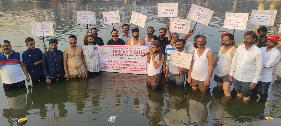मानवी हक्क संरक्षण,जागृती व दिलासा संस्थाच्या वतीने प्रदूषीत इंद्रायणी नदीमध्ये तोंडाला काळया पट्ट्या बांधून,अर्धनग्न आंदोलन.