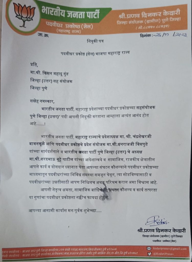 मावळ मराठा न्युज :- कुसगाव बुद्रुकचे सामाजिक कार्यकर्ते किसन महादू गुंड यांना भाजपा जिल्हाध्यक्ष श्री शरदभाऊ बुट्टे पाटील यांच्या हस्ते पुणे जिल्हा (उत्तर )सह संयोजक पदी नियुक्ती पत्र देण्यात आले. किसन गुंड हें यापूर्वी कुसगाव बुद्रुकचा भाजपा अध्यक्ष म्हणून काम करत होतो. तसेच त्याआधी शक्तीकेंद्र म्हणून काम केलेलं आहे.त्यामुळे त्यांचेवर पक्षाने मोठी जबाबदारी दिली आहे. पक्षाने माझेवर दाखवलेला विश्वास मी सार्थ ठरविन असा विश्वास किसन गुंड यांनी मावळ मराठा न्युज शी बोलताना व्यक्त केला. या नियुक्तीनंतर त्यांचेवर अभिनंदनाचा वर्षाव होतं आहे. त्यांना पुढील वाटचालसाठी मावळ मराठा न्युज कडून हार्दिक शुभेच्छा.