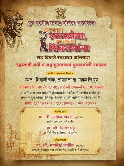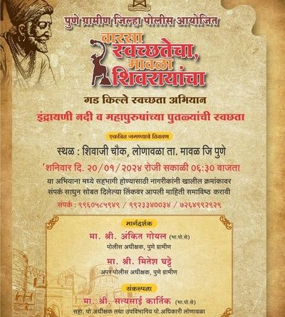 पुणे ग्रामीण पोलीस आयोजित वारसा स्वच्छतेचा,मावळा शिवरायांचा,गड किल्ले स्वच्छता अभियाना अंतर्गत २० जानेवारीला स्वछता अभियान जनजागृती