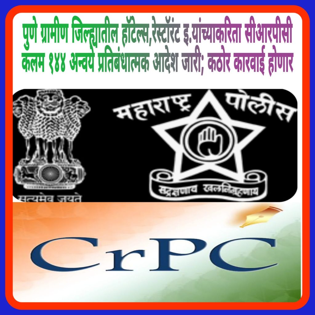 पुणे ग्रामीण जिल्ह्यातील हॉटेल्स,रेस्टॉरंट इ.यांच्याकरिता सीआरपीसी कलम १४४ अन्वये प्रतिबंधात्मक आदेश जारी; कठोर कारवाई होणार