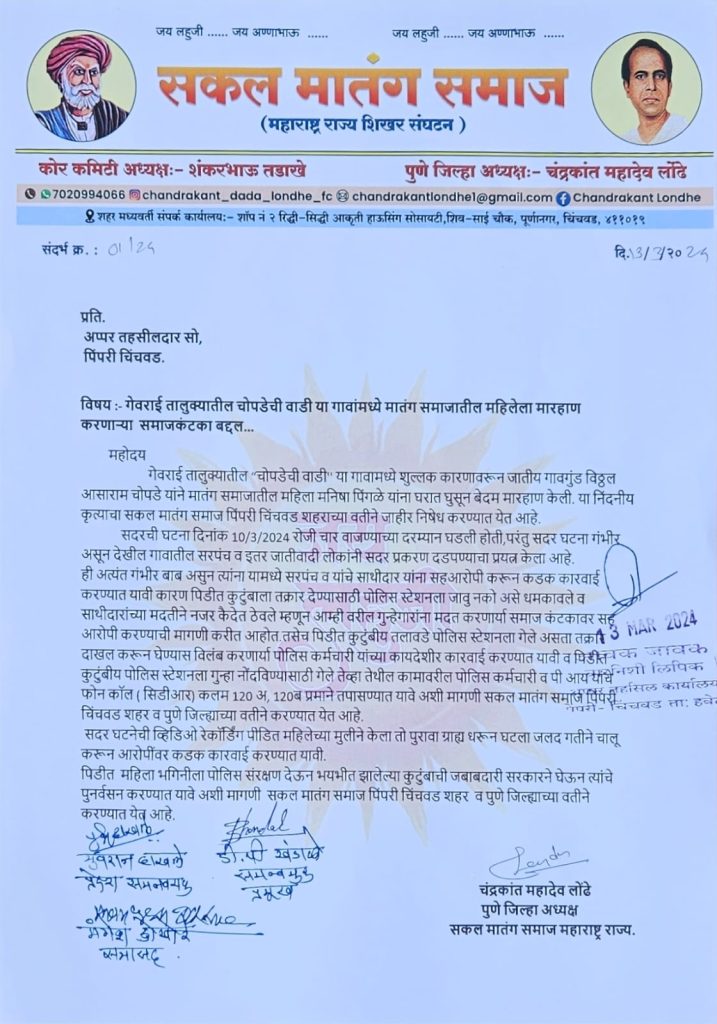 मावळ मराठा न्युज :-पिंपरी – प्रतिनिधी, गेवराई तालुक्यातील “चोपडेची वाडी” या गावामध्ये शुल्लक कारणावरून जातीय गावगुंड विठ्ठल आसाराम चोपडे यांने मातंग समाजातील महिला मनिषा पिंगळे यांना घरात घुसून बेदम मारहाण केली. या निंदनीय कृत्याचा सकल मातंग समाज पिंपरी चिंचवड शहराच्या वतीने जाहीर निषेध करून मंगेश डाखोरे यांच्या नेतृत्वाखाली नायब तहसिलदार यांना निवेदन देण्यात आले सदरची घटना दिनांक १०/३/२०२४ रोजी चार वाजण्याच्या दरम्यान घडली होती,परंतु सदर घटना गंभीर असून देखील गावातील सरपंच व इतर जातीवादी लोकांनी सदर प्रकरण दडपण्याचा प्रयत्न केला आहे.ही अत्यंत गंभीर बाब असुन त्यांना यामध्ये सरपंच व यांचे साथीदार यांना सहआरोपी करून कडक कारवाई करण्यात यावी कारण पिडीत कुटुंबाला तक्रार देण्यासाठी पोलिस स्टेशनला जावु नको असे धमकावले व साथीदारांच्या मदतीने नजर कैदेत ठेवले म्हणून आम्ही वरील गुन्हेगारांना मदत करणार्या समाज कंटकावर सह आरोपी करण्याची मागणी करीत आहोत.तसेच पिडीत कुटुंबीय तलावडे पोलिस स्टेशनला गेले असता तक्रार दाखल करून घेण्यास विलंब करणार्या पोलिस कर्मचारी यांच्या कायदेशीर कारवाई करण्यात यावी व पिडीत कुटुंबीय पोलिस स्टेशनला गुन्हा नोंदविण्यासाठी गेले तेव्हा तेथील कामावरील पोलिस कर्मचारी व पी आय यांचे फोन कॉल ( सिडीआर) कलम १२० अ, १२० ब प्रमाने तपासण्यात यावे अशी मागणी सकल मातंग समाज पिंपरी चिंचवड शहर व पुणे जिल्ह्याच्या वतीने करण्यात येत आहे. सदर घटनेची व्हिडिओ रेकॉर्डिंग पीडित महिलेच्या मुलीने केला तो पुरावा ग्राह्य धरून घटला जलद गतीने चालू करून आरोपींवर कडक कारवाई करण्यात यावी.पिडीत महिला भगिनीला पोलिस संरक्षण देऊन भयभीत झालेल्या कुटुंबाची जबाबदारी सरकारने घेऊन त्यांचे पुनर्वसन करण्यात यावे अशी आम्ही सकल मातंग समाज पिंपरी चिंचवड शहर समन्वयक प्रमुख डी पी खंडाळे, पुणे जिल्हा अध्यक्ष चंद्रकांत दादा लोंढे, प्रदेश समन्वयक युवराज दाखले, सतिश भवाळ,रामदास कांबळे,आण्णा भाऊ साठे जयंती महोत्सव समिती अध्यक्ष आण्णासाहेब कसबे,राजु चव्हाण, आबासाहेब मांढरे, कैलास पाटोळे,मंगेश डाखोरे, अनिल तांबे, सविताताई आव्हाड, मिराताई अल्लाट, संगीताताई जाधव,आदी समाज बांधव यांनी पीडितांच्या पुनर्वसनाची मागणी केली.