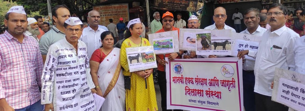मावळ मराठा न्युज :- सांगवीतील मजूर अड्ड्यावर मानवी हक्क संरक्षण आणि जागृती व दिलासा संस्थेच्या वतीने भितीपत्रके वाटून,शपथ देऊन कविता सादर करुन व आवाहन करून जागृती करण्यात आली.१७ व्या लोकसभेचा मतदानाचा टक्का वाढावा म्हणून अशिक्षित असणाऱ्या मजूर अड्ड्यावर जनजागृती करण्यात आली.यामध्ये आण्णा जोगदंड यांनी आपल्या शर्टवर मतदान सर्व श्रेष्ठ काम, मतदार राजा जागा हो, लोकशाहीचा धागा हो. आपलं मत लोकशाहीला मत.प्रलोभनांना बळी पडू नका .असे शर्टवर लिहून जोगदंड स्पीकर मधून मजूर कामगारांना मतदान करण्यासाठी नम्रपणे आवाहन करत होत.त्यांनी मतदान करण्याची शपथ दिली.दिलासा संस्थेचे अध्यक्ष सुरेश कंक म्हणाले की, आपली लोकशाही बळकत करण्यासाठी शासनाने दिलेल्या सुट्टीच्या दिवशी भटकंती न करता मतदान करण्याचे आवाहन करत होते. जाती-धर्माच्या नावावर मतदान न करता,आपल्या परिसराची व नागरिकांच्या प्रश्नांची जाण असलेल्या सुशिक्षित मतदारांना मतदान करण्याचे आवाहन त्यांनी केले.आपल्या मताची किंमत जनावरांच्या किमतीपेक्षा कमी करुन ते विकू नका .मताची किंमत पैसात करू नका असे आवाहन संस्थाअध्यक्ष विकास कुचेकर यांनी केले आहे. मराठवाडा जनविकास संघाचे अध्यक्ष अरूण पवार म्हणाले की आपण कोणत्याही प्रलोभनांना बळी न पडता निर्भयपणे मतदान करा.आपल्या मताची किंमत पैशात करू नका .जेष्ट साहित्यिक श्रीकांत चौगुले यांनी अनेक नागरिकांना विधानसभा ,राज्यसभा ,लोकसभा,याची परीपूर्ण माहिती नसते अशा अशिक्षित मजूरांना आपली संस्था माहिती देऊन मतदान करण्याचे राष्ट्रीय कर्तव्य बजावत आहे याचा मला आनंद वाटतो.राजु सावळे म्हणले कि स्वच्छ प्रतिमेच्या उमेदवाराला मतदान करा सध्या उमेदवारची सर्व माहिती वेबसाईटवर दिलेली असते मतदान करण्यापुर्वी उमेदवाराची माहिती घेऊनच मतदान करण्याचे आव्हान केले.यावेळी स्लोगनवर घ्या मातृभूमीची आण ,करा मतदान. तुम हो महान करके मतदान .आपलं मत विकासाला मत .मतदार राजा जागा हो, लोकशाहीचा धागा हो .असे अनेक फलक नागरिकांच्या हातात दिसत होते.वेगवेगळ्या जनावरांची चित्र काढून त्यांची किमती लिहिलेले स्लोगन नागरिकांच्या हातात होते.कवी शरद शेजवळ यांनी मतदान जनजागृती वर आपली रचना सादर केली. प्रास्ताविक तानाजी एकोंडे यांनी केले तर आभार सुभाष चव्हाण यांनी मानले. यावेळी मानवी हक्क संरक्षण आणि जागृतीचे संस्थापक अध्यक्ष विकास कुचेकर,शहराध्यक्ष आण्णा जोगदड, पश्चिम महाराष्ट्र महिला अध्यक्षा संगीता जोगदंड ,दिलासा संस्थेचे अध्यक्ष सुरेश कंक, उपाध्यक्ष सुभाष चव्हाण ,विकास शहाणे ,श्रीकांत चौगले, निलेश हंचाटे,मराठवाडा जनविकास संघाचे अध्यक्ष अरूण पवार, पर्यावरण अभ्यासक तानाजी एकोंडे, सा.का.गण