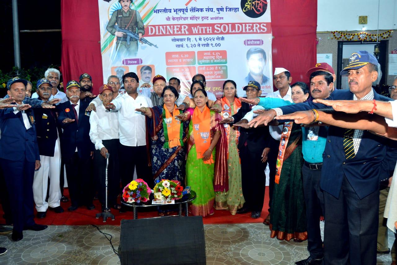 मावळ मराठा न्युज :-पिंपरी, (प्रदीप गांधलीकर )दिनांक : ०७ मे २०२४ “राष्ट्र आणि राष्ट्रहित प्रथम हे सैनिकांचे ब्रीद असते आणि निवृत्तीनंतरही ते प्राणपणाने जोपासण्याचा प्रत्येक सैनिक प्रयत्न करीत असतो!” असे विचार निवृत्त ब्रिगेडियर मधुकर प्रचंड यांनी श्री केदारेश्वर मंदिर प्रांगण, पेठ क्रमांक २४, लोकमान्य हॉस्पिटल मागे, प्राधिकरण येथे सोमवार, दिनांक ०६ मे २०२४ रोजी व्यक्त केले. महाराष्ट्र दिनानिमित्त पुणे जिल्हा भारतीय भूतपूर्व सैनिक संघ आणि श्री केदारेश्वर मंदिर ट्रस्ट यांच्या संयुक्त विद्यमाने आयोजित डीनर विथ सोल्जर्स अर्थात सैनिकांसोबत स्नेहभोजन या विशेष उपक्रमात सार्जंट जयंत टोपे, हेमंत काजळे, धनंजय लोखंडे, डी. आर. पडवळ, अण्णाभाऊ साठे महामंडळाचे अध्यक्ष अमित गोरखे, माजी उपमहापौर शैलजा मोरे, माजी नगरसेविका शर्मिला बाबर, राष्ट्रवादी (अजित पवार गटाच्या) प्रदेश सचिव शीला भोंडवे, शिवसेना महिला जिल्हाप्रमुख शैला पाचपुते, शहर संघटिका सरिता साने, सलीम शिकलगार, विजय शिनकर, प्राधिकरण ज्येष्ठ नागरिक संघाचे नवनिर्वाचित अध्यक्ष भगवान महाजन, पुणे जिल्हा भारतीय भूतपूर्व सैनिक संघाचे मानद सचिव दत्तात्रय कुलकर्णी, श्री केदारेश्वर मंदिर ट्रस्टचे अध्यक्ष राजू मोरे, मुख्य संयोजक चंद्रकांत उर्फ बाळा शिंदे यांची प्रमुख उपस्थिती होती.या उपक्रमात स्वागत करताना दत्तात्रय कुलकर्णी म्हणाले की, “०४ डिसेंबर १९७१ रोजी भारतीय नौदलाने कराची येथे केलेल्या आक्रमणात पाकिस्तानच्या पाच जहाजांचा पूर्णपणे बीमोड करण्यात आला होता. मी त्या कारवाईत सहभागी असल्याने त्या भाग्यवान क्षणांच्या आठवणी अजूनही मनात ताज्या आहेत!”अमित गोरखे म्हणाले की, “माजी सैनिकांसोबत काही क्षण घालवता आले ही अभिमानास्पद बाब आहे. छत्रपती शिवाजीमहाराज यांची मुद्रा सैन्यदलात प्रस्थापित करण्यात आली, सैन्यदलातील बँडवर पूर्वी इंग्लिश शैलीतून ठरावीक गीते वाजवली जात असत; पण या दहा वर्षांत “ए मेरे वतन कें लोगों…” , “ने मजसी ने…” यासारखी गीते वाजवली जात आहेत. युक्रेन युद्धात अडकलेल्या भारतीय युवतीची सुटका करण्याचे धैर्य दाखविण्यात आले, यासारख्या घटना भारतीय जनमानसाला गौरवास्पद वाटतात. याप्रसंगी उपस्थित असलेल्या भूदल, नौदल आणि वायुसेनेत विविध पदांच्या माध्यमातून देशासाठी योगदान देणाऱ्या माजी सैनिकांनी उत्स्फूर्तपणे भारत – पाक युद्ध, बांगलादेश मुक्ती युद्ध, श्रीलंकेत पाठवलेली शांतीसेना तसेच कारगिल युद्ध यामधील आपले रोमांचक अनुभवकथन करून श्रोत्यांना खिळवून ठेवले. चंद्रकांत उर्फ बाळा शिंदे यांनी प्रास्ताविक केले. सूर्यकांत मुथियान यांनी मतदान करण्याविषयी सामुदायिक शपथ दिली. माजी सैनिकां