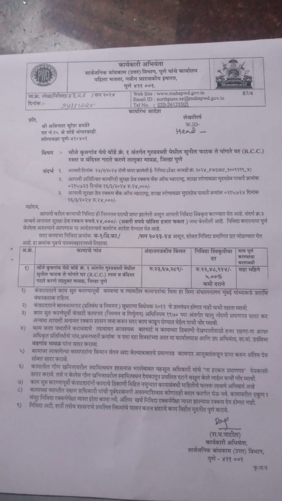 मावळ मराठा न्युज,कुसगाव :- मावळ चे लोकप्रिय आमदार सुनील आण्णा शेळके यांच्या आमदार निधीमधून कुसगाव ग्रामपंचायत सदस्य असलेले प्रदीप कोकरे, नितीन मोरे,संगीता गायकवाड यांच्या प्रयत्नातून वार्ड क्रमांक एक मध्ये आरसीसी गटर व रस्त्याचे काम एकूण किंमत रु.२३,६७,२८९/- मंजूर केले असून ग्रामस्थांच्या सेवेसाठी रस्ता आणि गटारी चे काम लवकरच पूर्ण होणार आहे. मोजें कुसगांव येथे वॉर्ड क्र. १ अंतर्गत गुरववस्ती येथील सुनील फाटक ते पांगारे घर (R.C.C.) रस्ता व बंदिस्त गटारे करणे साठी निधी उपलब्ध झाला आहे.तसें पत्र देखील सार्वजनिक बांधकाम विभागाकडून ठेकेदाराला देण्यात आले आहे सहा महिन्याचा आत ही कामे होणार आहेत.त्याबद्दल मावळचे आमदार सुनील शेळके यांचे प्रदीप कोकरे,नितीन मोरे आणि संगीता गायकवाड यांनी वॉर्ड क्रमांक एक च्या ग्रामस्थांच्या वतीने अभिनंदन आणि आभार व्यक्त केले आहे.