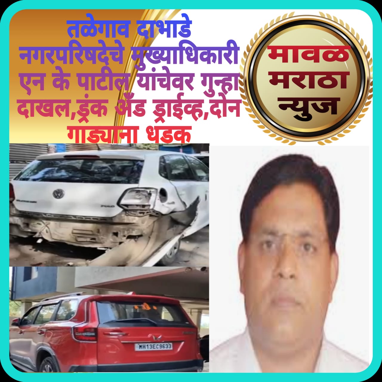 तळेगाव दाभाडे नगरपरिषदेचे मुख्याधिकारी एन के पाटील यांचेवर गुन्हा दाखल,ड्रंक अँड ड्राईव्ह,दोन गाड्या धडक