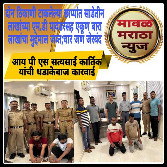 मावळ मराठा न्युज सहा.पोलीस अधीक्षक श्री सत्यसाई कार्तीक यांची संकल्प नशामुक्ती अभियानांतर्गत अमलीपदार्थ विकणाऱ्या ड्रग्ज पेडलरांविरोधात दणकेबाज कारवाई. दोन ठिकाणी टाकलेल्या छाप्यांमध्ये साडेतीन लाखांच्या एम.डी पावडरसह एकूण बारा लाखांचा मुद्देमाल जप्त; चार जण जेरबंद.लोणावळा उपविभागाचे सहा. पोलीस अधीक्षक श्री सत्यसाई कार्तिक यांनी उपविभागाचा पदभार स्वीकरल्यानंतर अवैध धंद्यांवर व गुन्हेगारांवर कायदेशीर कारवाईची मालिका सुरूच ठेवली आहे. गेल्या काही दिवसांपासून लोणावळा विभागात अमली पदार्थांची चोरून विक्री होत असुन त्यामुळे परिसरातील तरुणाई नशेच्या आहारी जात असल्याची माहिती श्री कार्तिक यांना मिळाली होती. त्यासाठी श्री सत्यासाई कार्तिक यांनी संकल्प नशामुक्ती अभियान हाती घेऊन त्याअंतर्गत परिसरातील युवकांमध्ये जनजागृती करणे, तसेच अमली पदार्थांचे सेवन, साठवणुक व विक्री करणाऱ्यांवर कठोर कारवाईचा बडगा उगारला आहे. संकल्प नशामुक्ती अभियानाचाच एक भाग म्हणून श्री सत्यसाई कार्तिक यांनी मावळ परिसरातील अमलीपदार्थ विकणाऱ्या गुन्हेगारांविरोधात गेल्या काही दिवसात कठोर कारवाया करून अनेक आरोपींना जेरबंद करून त्यांचेकडून मोठ्या प्रमाणावर अमली पदार्थ हस्तगत केले आहेत. दिनांक ०९/०६/२०२४ रोजी सत्यसाई कार्तीक यांनी त्यांचे पथकासह टाकलेल्या छाप्यात कामशेत पो.स्टे हद्दीतील गगन न्यू लाईफ सोसायटी समोर, रमेश शिंदे यांचे चाळीत इसम नामे १) दिनेश दीपक शिंदे, वय २४ वर्ष, राहणार कामशेत, तालुका मावळ, जिल्हा पुणे व २) सौरभ राजेश शिनगारे, वय २४ वर्ष, राहणार कामशेत, तालुका मावळ जिल्हा पुणे यांना ताब्यात घेऊन पंचांसमक्ष त्यांची झाडाझडती घेतली असता त्या दोघांचे ताब्यातून वेगवेगळ्या वजनाचे एकूण ३२ ग्रॅम एमडी पावडर हा अमलीपदार्थ व त्याची पॅकिंग करून विक्री करण्यासाठी वापरण्यात येणाऱ्या पॅकींगच्या प्लास्टिकच्या पिशव्या असा एकूण ३ ,२० ,१४६ /- रू. किमतीचा मुद्देमाल जप्त करण्यात आला असून पो कॉ अमोल ननवरे यांनी दिलेल्या फिर्यादीवरून एन.डी.पी.एस ॲक्ट १९८५ चे विविध कलमान्वये कामशेत पोलीस स्टेशन येथे गुन्हा नोंद कण्यात आला आहे तसेच पुढील तपास कामशेत पो.स्टे चे पोलीस उपनिरीक्षक शुभम चव्हाण हे करत आहेत. तसेच दिनांक १६/०६/२०२४ रोजी श्री कार्तिक यांना मिळालेल्या गुप्त माहितीच्या आधारे सकाळी ०६ .२० वाजताचे सुमारास इसम नामे १) शिवाजी मारुती कडू, वय ३५ वर्ष, राहणार कुरवंडे, तालुका मावळ, जिल्हा पुणे व २) दिलीप बबन पिंगळे, वय २९ वर्षे, राहणार कुनेगाव, तालुका मावळ, जिल्हा पुणे हे त्यांचे ताब्यातील मारुती सुझुकी ब्रेझ्झा गाडीतून लोणावळा दिशेकडे जात असताना लोणावळा पो.स्टे हद्दी