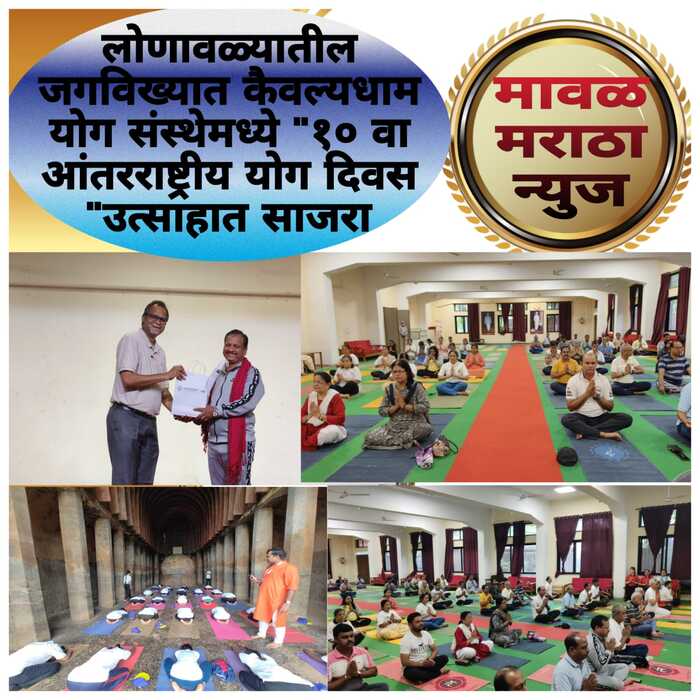 मावळ मराठा न्युज :-लोणावळा,लोणावळ्यातील जगविख्यात कैवल्यधाम योग संस्थेमध्ये ” १० वा आंतरराष्ट्रीय योग दिवस ” आज मोठ्या उत्साहात साजरा करण्यात आला. योग दिवसाची सुरुवात शांती पाठाने करण्यात आली. प्रमुख पाहुणे बार कौन्सिल ऑफ महाराष्ट्र आणि गोवा चे अध्यक्ष, ऍड श्री राजेंद्र उमप, कैवल्यधाम योग महाविद्यालयाच्या प्राचार्या श्रीमती बंदिता सतपते, निवृत्त ब्रिगेडियर श्री सुहास धर्माधिकारी यांच्या शुभ हस्ते दिप प्रज्वलन करण्यात आले. या प्रसंगी लोणावळ्यातील विविध क्षेत्रातील मान्यवर व्यक्ती व महिला वर्ग, कैवल्याधाम संस्थेतील अधिकारी वर्ग, लोणावळा शहरातील पत्रकार वकील बांधव मोठ्या संख्येने उपस्थित होते. प्रमुख पाहुणे राजेंद्र उमप यांनी उपस्थितांना संबोधित केले. आपल्या भाषणातून त्यांनी भारताचे पंतप्रधान श्री नरेंद्र मोदी यांनी २१ जून आंतरराष्ट्रीय योग दिवस सुरु केला याबद्दल त्यांचे कौतुक केले. तसेच कैवल्यधाम संस्थेच्या शताब्दी वर्षास शुभेच्छा दिल्या.योगा प्रोटोकॉल प्रमाणे कैवल्यधाम संस्थेच्या योगाचार्या श्रीमती संध्या दीक्षित यांनी उपस्थिताना योगाचे धडे दिले. आंतरराष्ट्रीय योग दिवसाचे औचित्य साधून मावळ तालुक्यातील कार्ला लेणी व भाजे लेणी, MTDC कार्ला, देहूरोड कॉन्टोन्मेंट बोॅर्ड , लोणावळ्यातील L & T Traning Centre, INS शिवाजी येथे कैवल्यधाम संस्थेतर्फे योग प्रशिक्षण वर्गाचे आयोजन करण्यात आले भाजे लेणी येथे संपर्क बालग्राम, भाजे येथील विद्यार्थी सहभागी झाले होते. तसेच कैवल्य विद्या निकेतन शाळा, कैवल्यधाम यांनी लोणावळ्यातील विविध शाळांमधील विद्यार्थ्यांसाठी योग प्रशिक्षण वर्गाचे विशेष आयोजन केले होते. १० वा आंतरराष्ट्रीय योग दिवस यशस्वीरीत्या साजरा करण्यासाठी महाराष्ट्र पर्यटन विकास महामंडळ तसेच लोणावळ्यातील ऍड श्री संजय गायकवाड यांचे विशेष सहकार्य लाभले.