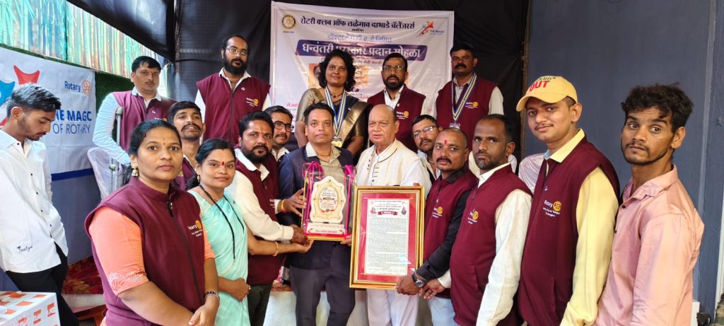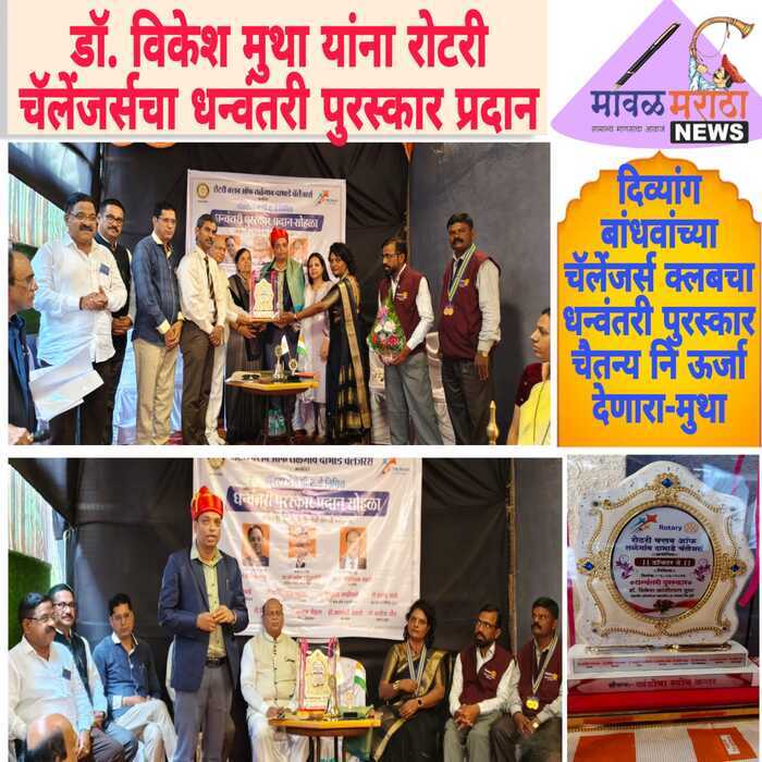 मावळ मराठा न्युज :- तळेगाव,रोटरी क्लब ऑफ तळेगाव दाभाडे चॅलेंजर्सच्या वतीने डॉक्टर डे निमित्ताने मावळ तालुक्यातील वैद्यकीय क्षेत्रातील दिग्गज व्यक्तिमत्व डॉ.विकेश मुथा यांना मायमर मेडिकल कॉलेजचे वैद्यकीय अधिकारी डॉ.दर्पण महेशगौरी यांच्या शुभहस्ते समारंभ पूर्वक धन्वंतरी पुरस्कार नुकताच तळेगाव दाभाडे येथील हॉटेल ड्रीम लंच होम येथे मान्यवरांच्या उपस्थितीत प्रदान करण्यात आला.रोटरी क्लब ऑफ तळेगाव दाभाडे चॅलेंजर्स हा जगातील पहिला दिव्यांग बांधवांचा क्लब नुकताच स्थापन झाला असून क्लबने पहिला उपक्रम डॉक्टर डे व सी.ए.डे थाटामाटात साजरा करुन समाजात एक नाविन्यपूर्ण संदेश निर्माण केला. आज पर्यंत विविध क्षेत्रातील ५४ पुरस्कार मिळाले परंतु दिव्यांग बांधवांच्या चॅलेंजर्स क्लबने दिलेला धन्वंतरी गौरव पुरस्कार हा मला नवीन चैतन्य आणि ऊर्जा देऊन गेला यापुढे अधिक काम करण्याची प्रेरणा या पुरस्काराने मिळाली असल्याचे प्रतिपादन डॉ. विकेश मुथा यांनी करताना रोटरी क्लबच्या कार्याचे कौतुक केले.तर रोटरी क्लब हा समाजातील गोरगरीब लोकांसाठी तळागाळापर्यंत जाऊन काम करतो रोटरी चॅलेंजर्सच्या आपण सदैव पाठीशी राहू असे प्रतिपादन प्रमुख पाहुणे डॉ.शाळीग्राम भंडारी यांनी केले तर मायमर मेडिकल कॉलेज व जनरल हॉस्पिटलच्या माध्यमातून आपण जगातील या असामान्य क्लबला सर्वतोपरी सहकार्य करू असे अध्यक्षीय भाषणातून डॉ.दर्पण महेशगौरी यांनी विशद करताना सर्व पुरस्कार्थींना शुभेच्छा दिल्या.आज पर्यंत समाजातून दिव्यांग बांधवांना मदत केली जाते परंतु हा क्लब स्थापन करून आम्ही समाजाला मदत करणार आहोत असे रोटरी क्लब ऑफ तळेगाव दाभाडे चॅलेंजर्सच्या अध्यक्षा रो.ज्योती राजिवडे यांनी विशद करताना क्लब स्थापनेची उद्दिष्टे कथन केली.क्लब ॲडव्हायझर रो.संजय मेहता यांनी प्रास्ताविकाद्वारे कार्यक्रमाचा हेतू व उद्देश विशद करताना उपक्रमाची माहिती कथन केली. क्लब ॲडव्हायझर रो.नितीन शहा यांनी धन्वंतरी पुरस्कार प्राप्त डॉ.विकेश मुथा यांना प्रदान करण्यात आलेल्या मानपत्राचे शब्दांकन व वाचन केले.डॉक्टर डे चे औचित्य साधून रोटरी क्लब ऑफ तळेगाव दाभाडे सिटीचे मेंबर डॉ.सौरभ मेहता,डॉ.धनश्री काळे,डॉ. गणपत जाधव,प्राथमिक आरोग्य केंद्राचे डॉ.उमेश गुट्टे यांना समारंभ पूर्वक सन्मानित केले तर सी.ए.डे चेऔचित्य साधून स्वानंद आगाशे,अमित कुमार,प्रसाद शिंदे यांना सन्मानित केले.सदर प्रसंगी असिस्टंट गव्हर्नर रो.रवींद्र भावे,रोटरी सिटीचे संस्थापक अध्यक्ष रो.विलास काळोखे,सिटीचे अध्यक्ष रो. किरण ओसवाल,उपाध्यक्ष रो. भगवान शिंदे,माजी अध्यक्ष रो. सुरेश शेंडे,सिटीचे सेक्रेटरी सुरेश दाभाडे,सल्लागार सुरेश धोत्रे ड