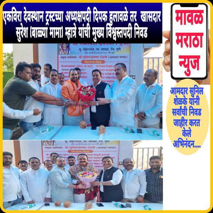 मावळ मराठा न्युज :-कार्ला,येथील एकविरा देवस्थान ट्रस्ट च्या अध्यक्षपदी कार्ला येथील दिपक निवृती हुलावळे तर उपाध्यक्ष पदी मारूती देशमुख व सागर देवकर यांची सर्वानुमते निवड करण्यात आली.तर सचिव पदी मुख्य पुजारी नवनाथ देशमुख खजिनदार पदी संजय गोविलकर सहसचिव पदी महेंद्र देशमुख सह खजिनदार पदी विकास पडवळ यांची निवड करण्यात आली. २०२३ पासून दोन सदस्यांच्या निवडीची प्रक्रिया चालू होती शनिवारी दोन सदस्यांची निवड पूर्ण करण्यात आली त्यानंतर आज सर्व विश्वस्तांनी सभा पार पडली या सभेत दिपक हुलावळे यांची अध्यक्ष म्हणून निवड करण्यात आली. तर खासदार सुरेश ऊर्फ बाळ्यामामा म्हात्रे यांची देवस्थानचे प्रमुख विश्वस्त म्हणून निवड करण्यात आल्याचे मावळचे आमदार सुनिल आण्णा शेळके यांनी जाहीर केले. आमदार सुनिल आण्णा शेळके यांनी सर्वांची निवड जाहीर करत सर्वांचे अभिनंदन केलेयावेळी मावळ तालुका खरेदी विक्री संघाचे माजी चेअरमन बाळासाहेब भानुसघरे, वेहरगाव सरपंच व देवस्थानच्या विश्वस्त वर्षा मावकर नंदकुमार पदमुले,संतोष मावकर, तानाजी पडवळ, संदीप आंद्रे, शहाजी पडवळ, संतोष राऊत, शांताराम मावकर,पांडुरंग मावकर,भरत येवले,अमोल हुलावळे,राजु हुलावळे सदाशिव सोनार, सुरेश कडू, बाळासाहेब गुंड, प्रशांत हुलावळे, सनी हुलावळे, संतोष हुलावळे, निवृत्ती देशमुख, गणेश देशमुख आदींनी निवनिर्वाचीत अध्यक्ष व पदाधिकाऱ्यांना शुभेच्छा दिल्या.गडावर येणाऱ्या भाविकांच्या अडचणी लक्षात घेता प्रथमतः गडावरील प्राथमिक सुविधा देण्यासाठी आम्ही प्रयत्न करू असे नवनिर्वाचित अध्यक्ष दिपक हुलावळे यांनी सांगितले तर राज्यातून व केंद्रातून देवस्थानासाठी आमदार सुनिल आण्णा शेळकें बरोबर मीही प्रयत्न करून देवस्थानाची ख्याती देशभर करू आणि एकविरा गड व परिसराचा विकास करू असे खासदार सुरेश ऊर्फ बाळ्या मामा म्हात्रे यांनी सांगितले.
