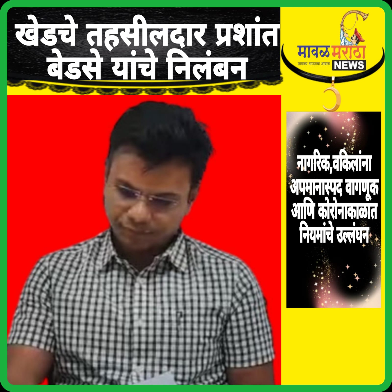 मावळ मराठा न्युज :-पुणे, खेडचे तहसीलदार प्रशांत बेडसे यांचे निलंबन झाले आहे. या आधी खेडचे प्रांताधिकारी जोगेंद्र कट्यारे यांचे निलंबन झाले होते. नागरिक आणि वकिलांना अपमानास्पद वागणूक देणे आणि कोरोनाकाळात नियमांचे उल्लंघन करणे या तक्रारींवरून राज्य शासनाने गुरुवारी,ता. ११ बेडसे यांच्यावर कारवाई केली आहे.निलंबनाबरोबरच बेडसे यांची विभागीय चौकशी सुद्धा सुरू करण्यात आली आहे. निलंबनाच्या काळात बेडसे यांचे मुख्यालय पुणे जिल्हाधिकारी कार्यालय राहील, आणि त्यांनी जिल्हाधिकाऱ्यांच्या पूर्व संमतीशिवाय मुख्यालय सोडता कामा नये, असे महसूल विभागाचे अवर सचिव संजीव राणे यांनी आदेशात म्हटले आहे.निलंबनाच्या काळात बेडसे यांनी खासगी नोकरी स्वीकारू नये किंवा धंदा अथवा व्यापार करू नये. असे केल्यास त्यांना निर्वाह भत्ता मिळणार नसल्याचे शासनाने स्पष्ट केले आहे. बेडसे हे मोहोळ आणि खेड येथे कार्यरत असताना कोरोना नियमांचे उल्लंघन करणे, नागरिक आणि वकिलांना अपमानास्पद वागणूक देणे अशा तक्रारी आल्या होत्या. त्यामुळे जनतेत शासनाची प्रतिमा मलिन झाली आहे, यामुळेच बेडसे यांचे निलंबन करण्यात आले आहे.