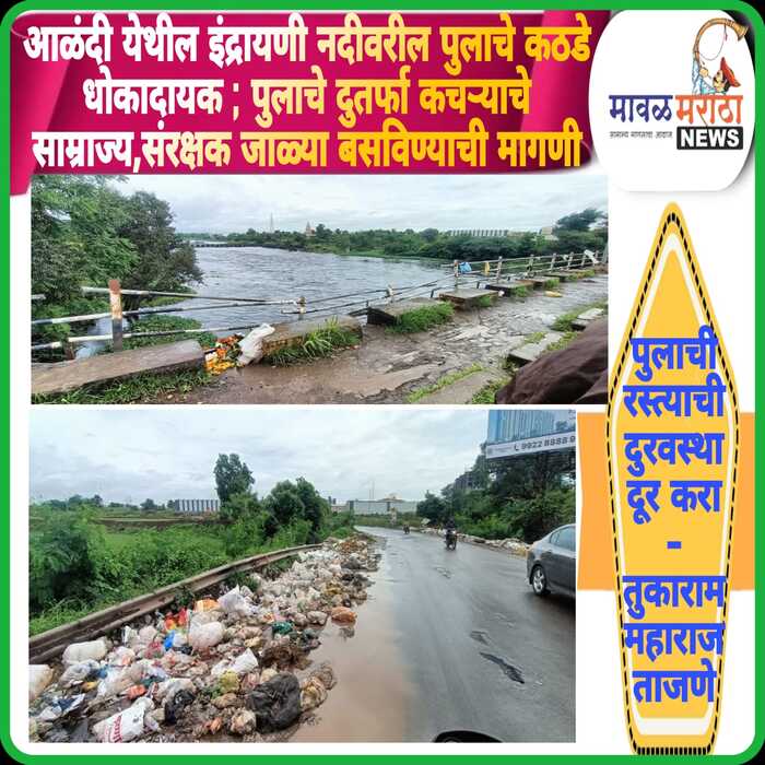 आळंदी येथील इंद्रायणी नदीवरील पुलाचे कठडे धोकादायक ; पुलाचे दुतर्फा कचऱ्याचे साम्राज्य,संरक्षक जाळ्या बसविण्याची मागणी