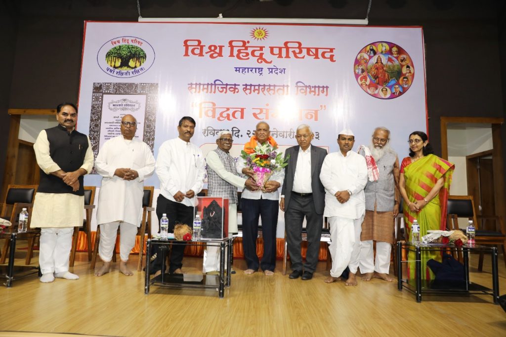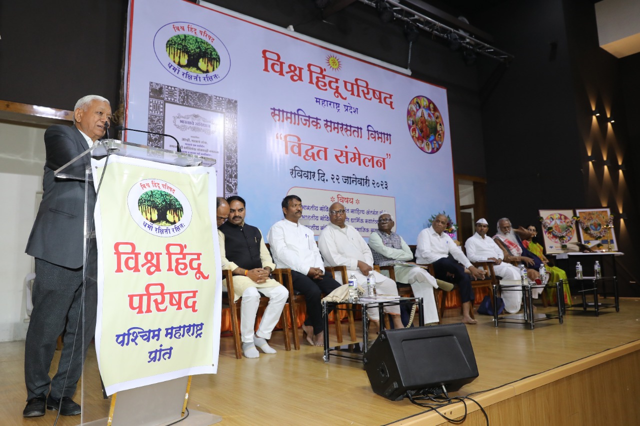 मावळ मराठा न्यूज,पिंपरी (प्रदीप गांधलीकर) दिनांक : २३ जानेवारी २०२३ “डॉ. बाबासाहेब आंबेडकरांनी संविधानाची कवचकुंडले बहाल केली त्यामुळे सामाजिक समरसता प्रस्थापित झाली!” असे विचार विश्व हिंदू परिषदेचे अखिल भारतीय समरसता विभागप्रमुख देवजीभाई रावत यांनी लेडी रमाबाई सभागृह, स. प. महाविद्यालय, टिळक रस्ता, पुणे येथे रविवार, दिनांक २२ जानेवारी २०२३ रोजी व्यक्त केले. विश्व हिंदू परिषदेच्या महाराष्ट्र प्रदेश सामाजिक समरसता विभागाच्या वतीने आयोजित करण्यात आलेल्या एक दिवसीय विद्वत संमेलनात बीजभाषण करताना देवजीभाई रावत बोलत होते. शिक्षण प्रसारक मंडळी पुणेचे अध्यक्ष ॲड. एस. के. जैन यांच्या हस्ते संमेलनाचे उद्घाटन करण्यात आले. याप्रसंगी विश्व हिंदू परिषद प्रांत सहमंत्री ॲड. सतीश गोरडे, पश्चिम महाराष्ट्र प्रांत अध्यक्ष पांडुरंग राऊत, ज्येष्ठ समाजसेवक पद्मश्री गिरीश प्रभुणे, प्रा. डॉ. रमेश पांडव, ह.भ.प. सुभाषमहाराज गेठे, माधवी सोनजी यांची व्यासपीठावर प्रमुख उपस्थिती होती. विश्व हिंदू परिषद प्रांतमंत्री प्रा. संजय मुदराळे यांनी प्रास्ताविक केले. उद्घाटनपर मनोगतातून ॲड. एस. के. जैन यांनी, “भारतीय संस्कृती निकृष्ट असून विद्वत्ता ही फक्त पाश्चात्यांकडे आहे, असे जाणीवपूर्वक बिंबवण्याचे षडयंत्र मेकॉलेप्रणीत शिक्षणपद्धतीच्या माध्यमातून केले गेले!” असे मत मांडले. यावेळी मान्यवरांच्या हस्ते प्रा. डॉ. श्यामा घोणसे लिखित ‘भारतीय संत आणि समरसता’ तसेच रमेश पतंगे लिखित ‘आपले संविधान’ या ग्रंथांचे लोकार्पण करण्यात आले. देवजीभाई रावत आपल्या बीजभाषणात पुढे म्हणाले की, “संविधानाच्या अंमलबजावणीमुळे जातपात, लिंगभेद आणि अस्पृश्यतेच्या शृंखला गळून पडल्या. शोषणमुक्ती अन् धार्मिकस्वातंत्र्याचा अधिकार प्राप्त झाला. अर्थातच संविधान परिपूर्ण असले तरी ते राबविणारी यंत्रणा सक्षम हवी. बुद्धिजीवी वर्गाने देशविघातक प्रवृत्तींचा प्रतिवाद केला पाहिजे!” भारतमाता आणि समरसतेचे मानदंड असलेल्या महापुरुषांच्या प्रतिमांचे पूजन, दीपप्रज्वलन, एकात्मता मंत्राचे सामुदायिक उच्चारण करून संमेलनाचा प्रारंभ करण्यात आला. यावेळी पांडुरंग राऊत यांचा डॉ. डी. वाय. पाटील विद्यापीठाची मानद डी.लिट. पदवी प्राप्त झाल्याबद्दल विशेष सत्कार करण्यात आला. निखिल कुलकर्णी यांनी परिचय करून दिला. प्रा. दिगंबर ढोकले यांनी सूत्रसंचालन केले.