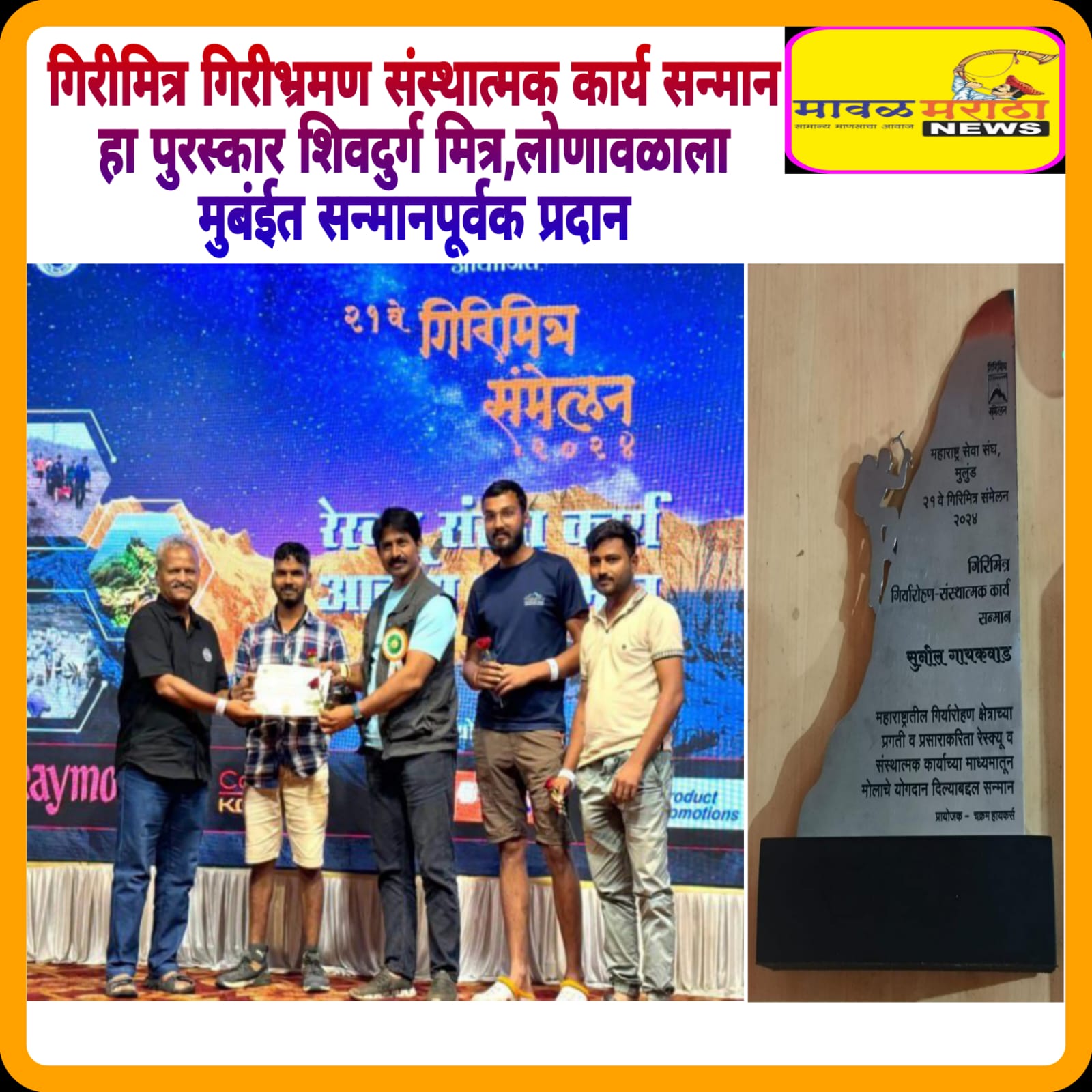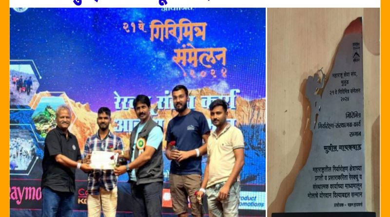 मावळ मराठा न्युज:- मुंबई दिनांक १३/०७/२०२४ व १४/०७/२०२४ रोजी महाराष्ट्रातील गिर्यारोहकांचे गिरी मित्र संमेलन वर्षे २१ वे नुकतेच महाराष्ट्र सेवा संघ, मुलुंड मुंबई येथे पार पडले. गिरीमित्र गिरीभ्रमण संस्थात्मक कार्य सन्मान हा पुरस्कार शिवदुर्ग मित्र, लोणावळाचे सचिव सुनिल गायकवाड यांना मिळाला. संमेलनाचे प्रमुख पाहुणे जागतिक किर्तीचे पोलंडचे जेष्ठ गिर्यारोहक Krzysztof Wielickiक्रिझताफ (क्रिस्ती)विलिन्की व इतिहास संशोधक अभ्यासक प्रविण भोसले यांच्या शुभहस्ते हा पुरस्कार प्रदान करण्यात आला.गिरी मित्र संमेलनाचे नियोजन चांगले होते, सर्व दिग्गज लोकांच्या भेटीगाठी या माध्यमातून होत असतात. महाराष्ट्रातील शोध व बचाव मोहिमा यांचीही आकडेवारी व प्रत्येक संस्थेचे कार्य यामध्ये शिवदुर्ग मित्र लोणावळा रेस्कु टिम चे कौतुक करण्यात आले व प्रशस्तीपत्र देऊन सन्मानित करण्यात आले.यशवती हायकर्स खोपोलीचे संस्थापक जेष्ठ गिर्यारोहक पद्माकर गायकवाड यांच्या हस्ते पुरस्कार प्रदान करण्यात आला.पुरस्कार स्विकारताना योगेश उंबरे, सुनिल गायकवाड, रतन सिंग, सिद्धार्थ आढाव उपस्थित होते .