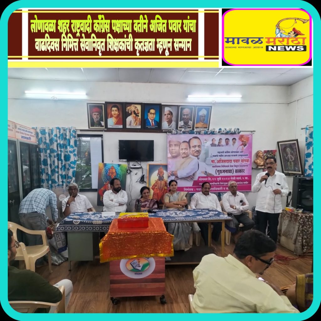 मावळ मराठा न्युज :- लोणावळा,राष्ट्रवादी काँग्रेस लोणावळा शहराच्या वतीने राष्ट्रवादी काँग्रेस पक्षाचे राष्ट्रीय आध्यक्ष तथा राज्याचे उपमुख्यमंत्री,अर्थमंत्री अजीतदादा पवार यांचा वाढदिवस साजरा करण्यात आला. गुरुपोर्णिमा व वाढदिवसांचे औचित्य साधून सेवानिवृत शिक्षकांचा कृतज्ञता व्यक्त करण्यासाठी त्यांचे सत्कार समारंभाचे शहर अध्यक्ष श्री. विलास बडेकर यांनी आयोजन केले होते.या,प्रसंगी राष्ट्रवादी काँग्रेस चे प्रांतीक सदस्य नारायण पाळेकर,मावळ तालुका कृषी उत्पन्न बाजार समितीचे संचालक साहेबराव टकले,माजी शहर अध्यक्ष जीवन गायकवाड,महिला अध्यक्षा उमा मेहता,माजी नगरसेविका आरोही तळेगांवकर,मुस्लीम सहकारी बँकेचे संचालक जाकीर खलीफा,आण्णाभाऊ साठे जंयती महोत्सव समितीचे अध्यक्ष नाना रोकडे,असंघटीत कामगार सेल अध्यक्ष तुषार सांवत,कष्टकरी सेल अध्यक्ष गणेश चव्हाण, शहर वरिष्ठ उपाध्यक्ष दिलीप पवार,अशोक रोकडे,ओबीसी सेल अध्यक्ष समीर खोले,सचिव नरेश खोडंगे,सरचिटणीस मारुती राक्षे,शहर युवक उपाध्यक्ष गौरव गंभीर,मारुती दाभाडे,हरि चव्हाण,लहू आण्णा गायकवाड,प्रणव हुलावळे ,निहाल चव्हाण,पवन धारिया आदी मान्यवर आणि कार्यकर्ते मोठ्या संख्येने उपस्थित होते,शिक्षक गोरख चौधरी ,रक्ष्मी शिरस्कर,मंगल राणे,सुनिल पानगांवकर, पत्रकार प्रदिप वाडेकर यांचा सत्कार करण्यात आला