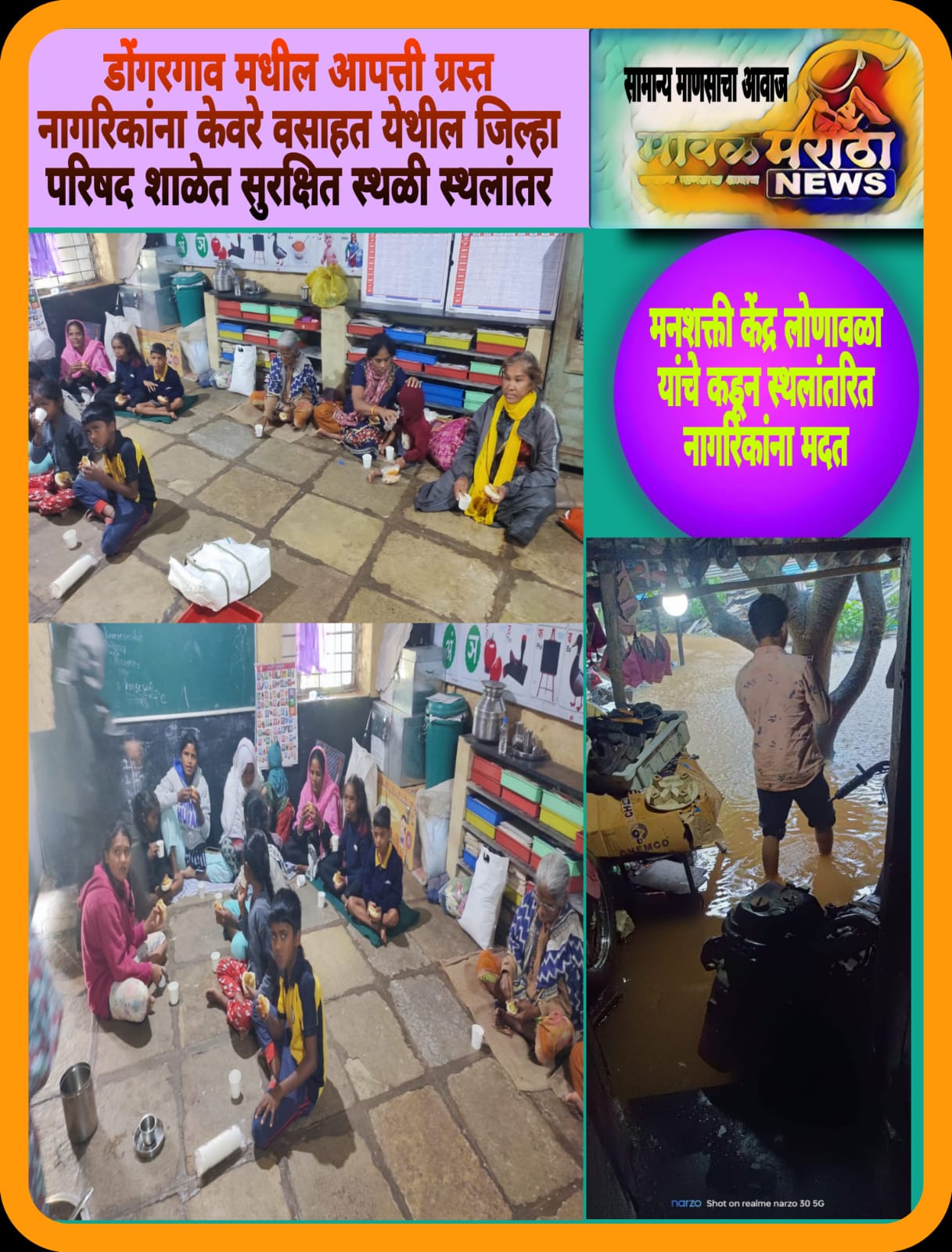 मावळ मराठा न्युज :- लोणावळा,डोंगरगाव मधील आपत्ती ग्रस्त लोकांना केवरे वसाहत येथील जिल्हा परिषद शाळेमध्ये हलवले आहे त्यांची दुपारच्या जेवणाची व्यवस्था वरसोली येथील जगप्रसिद्ध मनशक्ती केंद्राच्या वतीने करण्यात आली आहे. तर संध्याकाळी डोंगरगाव चे ग्रामसेवक,वरसोली मंडळाधिकारी उज्वला पवार,पोलीस पाटील कचरे पाटील, सरपंच सुनील येवले यांच्या सहकार्यातून आपत्तीग्रस्त स्थलांतरित नागरिकांची भोजन व्यवस्था करण्यात आली.त्यांना सुरक्षित स्थळी हलवून त्यांची काळजी घेण्यात येत आहे. तसेच पंकज भाऊ खोले यास कडुन नाष्टा व चहाची सोय करण्यात आली.अश्याच कुठे आपत्तीग्रस्त नागरिकांना मदत हवी असल्यास त्यांना भोजनची व्यवस्था मनशक्ती केंद्राच्या वतीने करण्यात येईल असे प्रमोद भाई शिंदे यांनी मावळ मराठाशी बोलताना सांगितले.