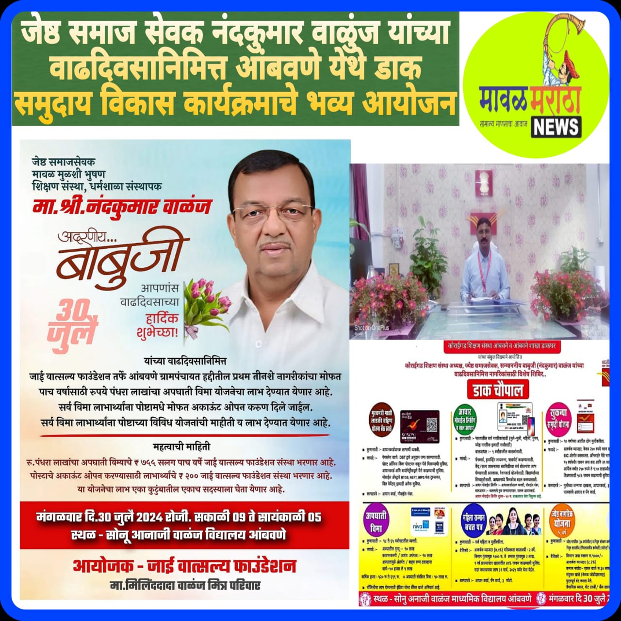 मावळ मराठा न्युज:- लोणावळा,”डाक चौपाल” डाक विभागाच्या विविध सेवांची पर्वणीच भारत सरकार, संचार मंत्रालय, डाक विभाग यांच्या मार्फत सप्टेंबर २०२४ पर्यंत संपूर्ण देशामध्ये ५००० गावांमध्ये डाक चौपाल अंतर्गत डाक समुदाय विकास प्रकल्प म्हणजेच गावांमध्ये डाक विभागाच्या विविध योजना जनसामान्यांपर्यंत पोहोचविण्याचा उपक्रम राबविण्यात येत आहे. त्याचाच एक भाग म्हणून भारतीय डाक विभाग व कोराईगड शिक्षण संस्था यांच्या संयुक्त विद्यमानाने, सोनू अनाजी वाळुंज माध्यमिक विद्यालय, आंबवणे येथे डाक समुदाय विकास कार्यक्रमाचे भव्य अयोजन दिनांक ३०.०७.२०२४ वार मंगळवार या दिवशी सकाळी १०:०० ते सायं ०५:०० या कालावधीत करण्यात आलेले आहे.डाक चौपाल या कार्यक्रमाअंतर्गत नागरिकांना मुख्यमंत्री माझी लाडकी बहिण योजनेत सहभागासाठी आवश्यक असलेले POSB खाते किंवा IPPB खाते (डिजिटल बँकिंग), आधार मोबाईल लिंकिंग, बाल आधार काढणे, टपाल जीवन विमा, सुकन्या समृध्दी योजना, किसान विकास पत्र, राष्ट्रीय बचत प्रमाणपत्र, महिला सन्मान बचत पत्र, ज्येष्ठ नागरिक योजना, प्रधानमंत्री जीवन ज्योती बिमा योजना, प्रधानमंत्री जन सुरक्षा योजना, अपघाती विमा काढणे तसेच पेन्शन धारकांसाठी जीवन प्रमाण पत्र काढणे अशा विविध सेवांची माहिती व लाभ नागरिकांना एकाच दिवशी एकाच ठिकाणी लाभ घेता येईल.डाक चौपाल मध्ये देण्यात येणाऱ्या पोस्टाच्या विविध योजनांचा लाभ आंबवणे व आसपासच्या गावातील जास्तीत जास्त नागरिकांनी उपस्थित राहून घ्यावा तसेच या संदर्भात अधिक माहितीसाठी श्री. रोहन देशमुख, शाखा डाकपाल आंबवणे किंवा आपल्या जवळच्या पोस्ट ऑफिस मध्ये संपर्क करावा असे आवाहन अधीक्षक डाकघर पुणे ग्रामीण विभाग, पुणेचे बाळकृष्ण पो. एरंडे यांनी केले आहे.