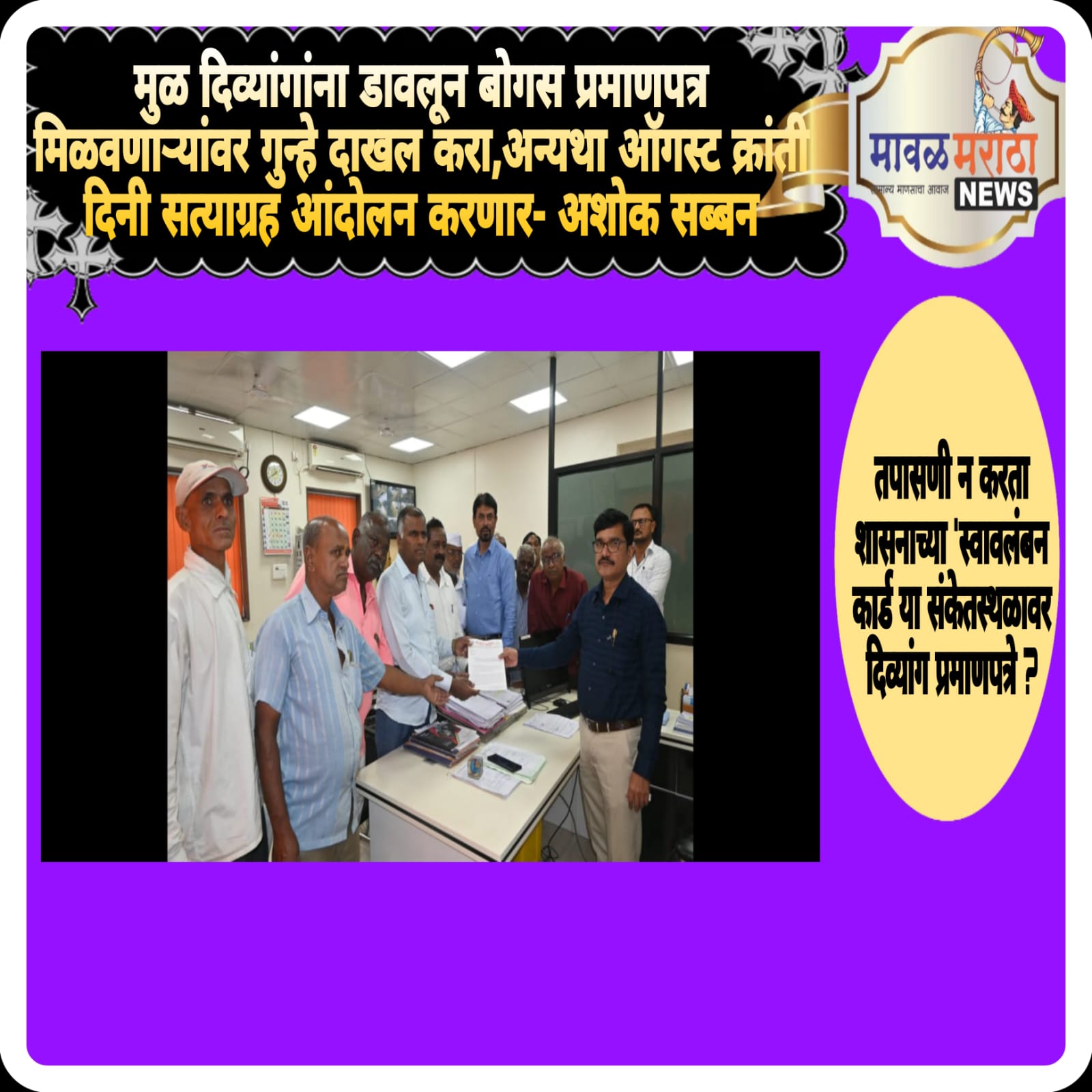 मुळ दिव्यांगांना डावलून बोगस प्रमाणपत्र मिळवणाऱ्यांवर गुन्हे दाखल करा,अन्यथा ऑगस्ट क्रांती दिनी सत्याग्रह आंदोलन करणार- अशोक सब्बन