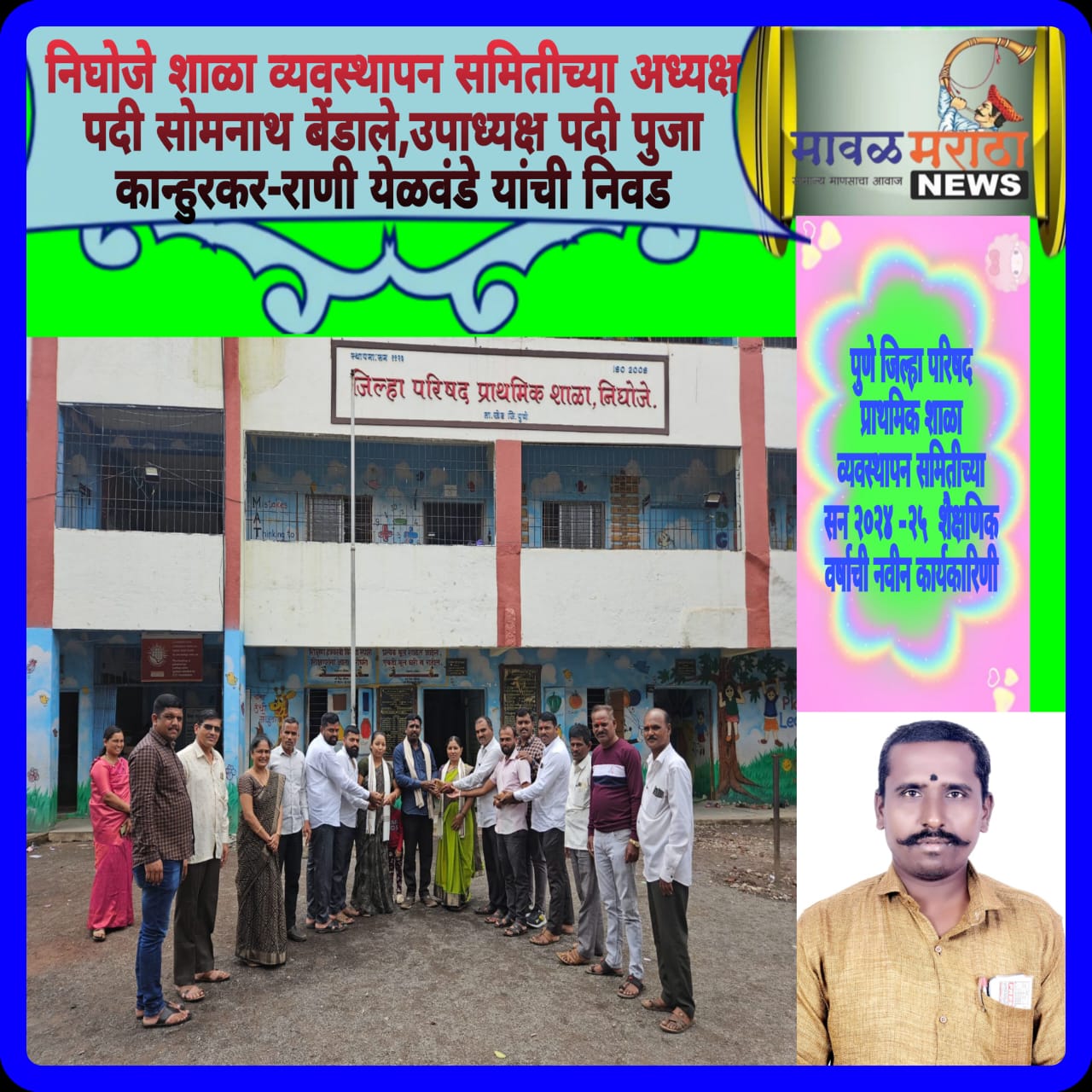 मावळ मराठा न्युज :- आळंदी ( अर्जुन मेदनकर ) : येथील महानगाव निघोजे पुणे जिल्हा परिषद प्राथमिक शाळा व्यवस्थापन समितीच्या सन २०२४ -२५ या शैक्षणिक वर्षातील नवीन कार्यकारिणी सह पदाधिकारी यांची निवड जाहीर करण्यात आली. या समितीच्या अध्यक्ष पदी सोमनाथ बेंडाले, उपाध्यक्ष पदी पुजा कान्हुरकर, राणी येळवंडे यांची बिनविरोध निवड झाल्याची घोषणा करण्यात आली. यावेळी निघोजे ग्रामपंचायत सरपंच सुनीता येळवंडे, उपसरपंच छाया येळवंडे, कैलास येळवंडे, शाळा व्यवस्थापन समिती सदस्य या सर्वांचे सर्व संमतीने एकमताने पत्रकार सोमनाथ साहेबराव बेंडाले यांची अध्यक्षपदी निवड करण्यात आली, यावेळी उपाध्यक्षपदी पुजा कान्हुरकर आणि राणी येळवंडे यांची निवड बिनविरोध करण्यात आली. यावेळी सदाशिव आंद्रे, सतिश आंद्रे, प्रशांत येळवंडे, संदिप शिरोळे, तुकाराम येळवंडे, गुलाब कोळेकर, सोमनाथ येळवंडे , सुनिल येळवंडे, अमित येळवंडे, तानाजी येळवंडे, संतोष येळवंडे, शाळेचे मुख्याध्यापक कृष्णदेव काटकर, निलम गायकवाड, निलम साळुंखे, वनिता येळवंडे, शाळेतील शिक्षिका रोहिणी गव्हाणे, विद्यार्थी शिक्षक पालक यांच्या वतीने शाल, श्रीफळ देऊन नवनिर्वाचित अध्यक्ष व उपाध्यक्ष यांचा सत्कार करण्यात आला. हुतात्मा राजगुरू पत्रकार संघाचे अध्यक्ष अर्जुन मेदनकर यांनी हार्दिक शुभेच्छा देवून अभिनंदन केले.
