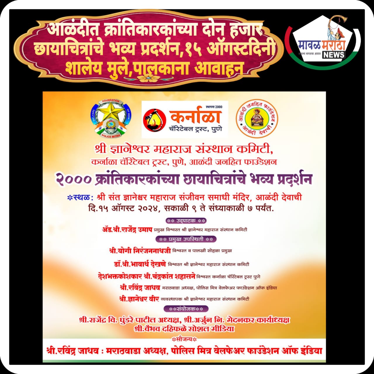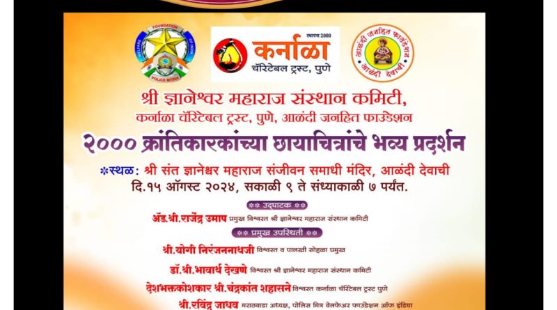 आळंदीत क्रांतिकारकांच्या दोन हजार छायाचित्रांचे भव्य मोफत प्रदर्शन,१५ ऑगस्ट दिनी शालेय मुले,पालक यांना आवाहन