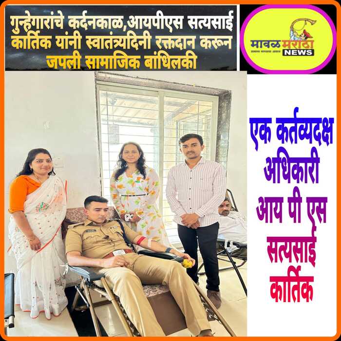 मावळ मराठा न्युज :-लोणावळा,आय पी एस सत्यसाई कार्तिक यांनी आपले लक्ष नशा मुक्ती,अमली पदार्थ तस्करी,बेकायदेशीर दारू विक्री करणारे यांचेवर केंद्रित केले आहे. जेणेकरून तरुण तरुण आपल्या शालेय व् महाविद्यालयीन जीवनात नशेच्या आहारी जाऊ नये नवीन पिढी ही चांगली घडावी हा त्यांचा त्यामागील उद्देश. नुकताच म्हणजे १५ ऑगस्ट स्वतंत्र दिनाचे औचित्य साधून कान्हे फाटा मावळ येथे रक्तदान व आरोग्य शिबिर संपन्न झाले या शिबिरास सिंघम डॅशिंग लोणावळा उपविभागाचे सहाय्यक पोलीस अधीक्षक आयपीएस श्री सत्यसाई कार्तिक यांनी विशेष उपस्थिती लावून स्वतः व रक्तदान करून सामाजिक बांधिलकी जपली.रुद्राक्ष क्लिनिक व सौ प्रमोदिनी आनंद टपाले यांच्या सहकार्यातून आज कान्हे फाटा येथील इको वैली सोसायटी मधे रक्त दान शिबिर व आरोग्य चाचण्या घेण्यात आल्या. ७५ लोकांनी रक्तदान तर २०० हून अधिक लोकांनी आरोग्य चाचण्या केल्या. प्रत्येक सहभागी रक्तदात्यास भेटवस्तू देण्यात आल्या.चाकण ब्लड बँक व डॉ. ऐश्वर्या काळे यांनी परिश्रम घेतले. सदर कार्यक्रमासाठी आयपीएस अधिकारी श्री सत्य साई कार्तिक यांनी विशेष भेट देऊन स्वतः रक्तदान देखील केले.या वेळी सोसायटी मधील नागरिक, कान्हे गावातील आजी माजी पदाधिकारी आवर्जून उपस्थित होते.सकाळी १० वाजता चालू झालेला कार्यक्रम सायकाळी ५:०० वाजता संपला.कार्यक्रमाच्या शेवटी सौ प्रमोदिनी आनंद टपाले व डॉ. ऐश्वर्या ताई काळे यांनी उपस्थितांचे आभार मानले.
