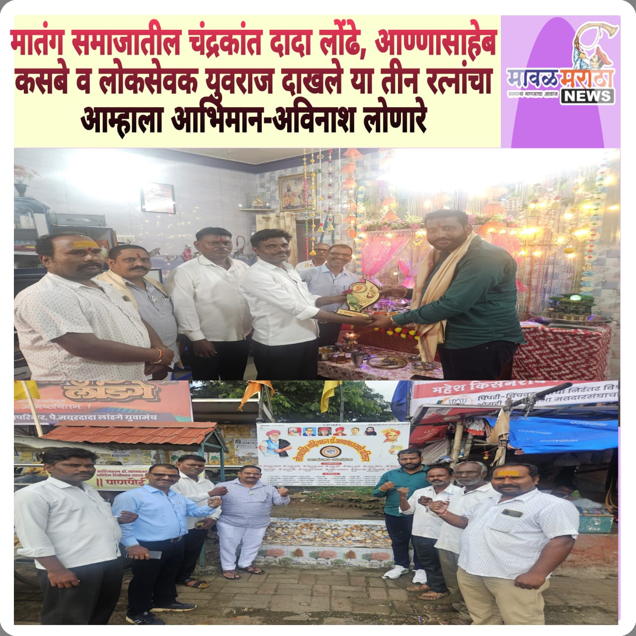 मावळ मराठा न्युज :-पिंपरी,प्रतिनीधी,सर्व सामान्य जनतेच्या न्याय व हक्कासाठी तसेच शैक्षणिक व आर्थिक प्रगतीसाठी सदैव कटिबद्ध असणारे पिंपरी विधानसभेतील इच्छुक लोकप्रतिनिधी चंद्रकांत दादा लोंढे, आण्णासाहेब कसबे व लोकसेवक युवराज दाखले हे समाजातील रत्न आहेत असे मत दिघी येथील साहित्यरत्न लोकशाहीर आण्णा भाऊ साठे प्रतिष्ठानचे अध्यक्ष अविनाश लोणारे यांनी व्यक्त केले.या रत्नांचा सन्मान स्मृती चिन्ह देऊन दिघी या ठिकाणी करण्यात आला. या प्रसंगी अध्यक्ष अविनाश लोणारे यांच्या घरच्या गणपती बाप्पाचे दर्शन घेतले.यावेळी प्रतिष्ठानचे संजय एडके,शिवाजी डावरे, राजेंद्र मोरे,विठ्ठल उपाडे,संतोष मोहीते,दिपक खुडे,फुलचंद घोडे,भरत गव्हाणे,आदी प्रमुख पदाधिकारी उपस्थित होते.