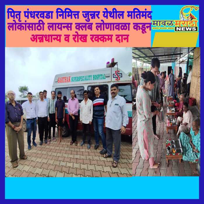 मावळ मराठा न्युज :-जुन्नर,पितृ पंधरवडा निमित्त जुन्नर येथील मतिमंद लोकांसाठी अन्नधान्य व रोख रक्कम दान करण्यात आली यात लोणावळाचे लायन राजाजी खंडेलवाल यांचेकडून १५ दिवसांचे अन्नधान्य लायन्स क्लबचे ला.प्रकाश जैन यांनी २१ ,०००,लायन देवल पारेख यांनी १० ,०९० तर लायन डॉ. पी एम ओसवाल यांनी २१०० रुपयाचीरोख मदत म्हणून दिलेत.पितृ पंधरवडा निमित्त जुन्नर येथील मतिमंद लोकांसाठी अन्नधान्य व रोख रक्कम देऊन लायन्स क्लब ने सामाजिक बांधिलकी जपली आहे.