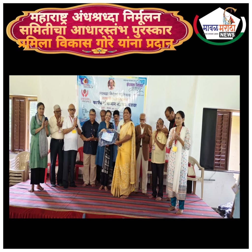 मावळ मराठा न्युज :-आळंदी,(अर्जुन मेदनकर)खेड तालुक्यातील केलेल्या उत्कृष्ट कार्याची दखल घेऊन महाराष्ट्र अंधश्रद्धा निर्मूलन समितीने चाकण येथील ज्ञानवर्धिनी विद्यालयाच्या मुख्याध्यापिका प्रमिला विकास गोरे यांना यावर्षीचा आधारस्तंभ पुरस्कार १५ सप्टेंबरला रायगड जिल्ह्यातील साने गुरुजी राष्ट्रीय स्मारक वडघर येथे हमीद दाभोलकर, साधनाचे संपादक विनोद शिरसाट, बालसाहित्यिक राजीव तांबे, मुक्ता दाभोलकर यांच्या हस्ते आणि अभिनेत्री सोनाली कुलकर्णी, मिलींद देशमुख,नंदिनी जाधव यांच्या उपस्थितीत प्रदान करण्यात आला. यावेळी चाकण महाराष्ट्र अंधश्रद्धा निर्मूलन समितीचे मनोहरबापू शेवकरी, राजगुरूनगर महाराष्ट्र अंधश्रद्धा निर्मूलन समिती च्याॲड. साधना बाजारे, ॲड. दिपाली वाळुंज आदी उपस्थित होते. आपणास महाराष्ट्र अंधश्रध्दा निर्मूलन समितीचा आधारस्तंभ पुरस्कार दिल्या बद्दल प्रमिला विकास गोरे यांनी कृतज्ञता व्यक्त केली आणि आभार मानले.
