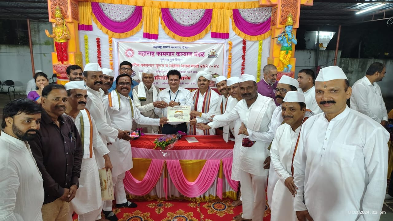 मावळ मराठा न्युज :- पुणे,महाराष्ट्र कामगार कल्याण मंडळ पुणे गटाच्या वतीने राष्ट्रपिता महात्मा गांधी राष्ट्रीय सप्ताह निमित्त गटस्तरीय कामगार पुरुष भजन स्पर्धा व महिला भजन स्पर्धा दिनांक ७ व ८ ऑक्टोबर२०२४ रोजी श्री विठ्ठल रुक्मिणी मंदिर एच. ए.कॉलनी पिंपरी पुणे १८.येथे संपन्न झाल्या सदर स्पर्धेत महिला भजन स्पर्धेत एकुण ११ संघाने व कामगार पुरुष भजन स्पर्धेत एकूण ८ संघाने सहभाग घेतला. कार्यक्रम पारितोषिक वितरण समारंभ प्रसंगी प्रमुख पाहुणे मा.सतिश मोटे सिनिअर मॅनेजर एच. आर टाटा मोर्टरस, पिंपरी.तसेच विशेष उपस्थिती मा.सौ.सुनिता शिवतारे सहाय्यक प्रबंधक,मानव संसाधन हिंदुस्थान एंटींबायोटिकस लि. पिंपरी., मा. ह. भ. प. विजय महराज बोत्रे संत साहित्याचे अभ्यासक,मा.विजय चौधरी उद्योजक स्वराज ग्रुप कंपनी. कार्यक्रमाचे अध्यक्ष ह.भ.प प्रशांत महाराज मोरे संत तुकाराम महाराज यांचे ११ वे वंशज अध्यक्ष,संत विचार महा परिषद महाराष्ट्र यांच्या अध्यक्षतेखाली संपन्न झाला. स्पर्धेचे परिक्षण ह.भ.प मधुकर मोरे,ह.भ.प नेहा कुलकर्णी ,ह.भ.प शिवनारायण काशीद यांनी केले.या प्रसंगी श्री विठ्ठल रुक्मीणी मंदिर पुजापाठ समितीचे दिलीप कोंडे,विजय जगताप,रवी चव्हाण,दिपक भुजबळ, एच.ए.एम.एस युनियन पदाधिकारी,गुणवंत कामगार शिवाजीराव शिर्के ,अण्णा जोगदंड, प्रकाश घोरपडे , शामराव गायकवाड, यादव तळोले,प्रवीण वाघमारे, राजेश हजारे,विकास कोरे, शंकर नानेकर इ.मान्यवर उपस्थित होते. सदर कार्यक्रमाकरिता मा.मनोज पाटील सहा. कल्याण आयुक्त पुणे.यांनी कार्यक्रमाचे प्रास्ताविक स्वागत यांनी केले सुत्रसंचालन सुनील बोरावडे केंद्र संचालक यांनी केले तर आभार प्रदिप बोरसे केंद्र संचालक ,यांनी मानले.कार्यक्रमाचे संयोजन अनिल कारळे, संदिप गावडे,अविनाश राऊत, अरुण वाडकर, रुपाली मुळीक,शोभा पांगारे,शुभांगी नावडिकर,सुचिता वाशिकर ,प्रतिभा येरम,सुरेखा मोरे,संगिता क्षिरसागर,माया कदम,भारत शहापूरकर,लक्ष्मीकांत पारसकर,प्रविण श्रीवास,दत्ता आढारी यांनी केले.