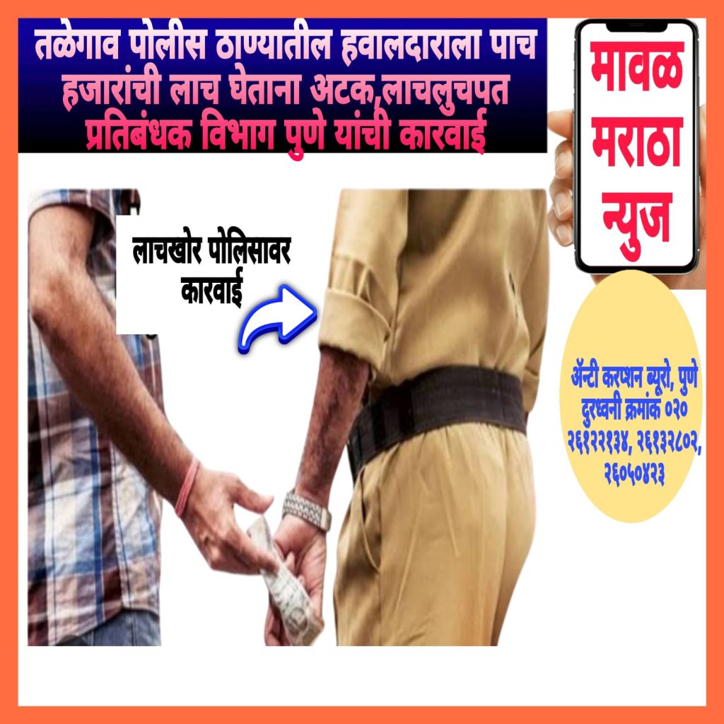 मावळ मराठा न्युज –तळेगाव, तळेगाव दाभाडे पोलीस स्टेशन हद्दीत मंत्रा सिटी रोडवर एका बियर शॉपीत काही वेळापूर्वी लाच लुचपत प्रतिबंधक विभागाने सापळा लावून एका हवालदाराला पाच हजारांची लाच घेताना पकडले.याप्रकरणी पोलीस हवालदार सतीश अरुण जाधव (वय ४२) यांच्याविरुद्ध तळेगाव पोलीस ठाण्यात गुन्हा दाखल करण्यात आला आहेथोडक्यात हकीकत अशी की तक्रारदार हे बिअर शॉपी चालवत असून, त्यांच्या दोन बिअर शॉपी आहेत. पोलीस हवालदार सतीश जाधव यांनी तक्रारदार यांचेकडे सदर बिअर शॉपी व्यवस्थित चालू ठेवण्यासाठी, कोणताही त्रास न होण्यासाठी व खोटे गुन्हे दाखल न करण्यासाठी प्रत्येक बिअर शॉपीचे ६,०००/- प्रमाणे दोन बिअर शॉपीचे एकुण १२,०००/- रुपयाची लाचेची मागणी स्वतःसाठी व पोलीस निरीक्षक यांचेसाठी केल्याची तक्रार तक्रारदार यांनी पुणे येथील लाचलुचपत प्रतिबंधक विभागाकडे येथे दिली होती.सदर तक्रारदार यांच्या तक्रारीची पडताळणी पंचासमक्ष केली असता, पोलीस हवालदार सतीश जाधव यांनी तक्रारदार यांच्याकडे वरील कामासाठी तडजोडीअंती ५,०००/- रुपयांची लाच मागणी करुन, ५,०००/- (पाच हजार रुपये) लाच रक्कम पंचासमक्ष स्वीकारली. सतीश जाधव याना ताब्यात घेण्यात आले असून, त्यांचेविरुद्ध तळेगाव दाभाडे पोलीस स्टेशन, पिंपरी-चिंचवड, पुणे येथे भ्रष्टाचार प्रतिबंध अधिनियम, सन १९८८ चे कलम ७, ७ अ प्रमाणे गुन्हा नोंद करण्याची प्रक्रिया सुरु आहे.लाचलुचपत प्रतिबंधक विभाग पुणे येथील पोलीस निरीक्षक प्रेम वाघमोरे तपास करत आहेत.सदरची कारवाई मा. पोलीस उपआयुक्त/पोलीस अधीक्षक श्री. शिरीष सरदेशपांडे, ला.प्र.वि. पुणे परिक्षेत्र, मा. अपर पोलीस अधीक्षक डॉ. शीतल जानवे, ला.प्र.वि. पुणे यांचे मार्गदर्शनाखाली पुणे लाचलुचपत प्रतिबंधक विभागाने केली.लोकसेवक शासकीय अधिकारी/कर्मचारी किंवा त्यांच्यावतीने खाजगी इसम (एजंट) हे कोणतेही शासकीय काम करून देण्यासाठी कायदेशीर फी व्यतिरिक्त अन्य लाचेची मागणी करीत असल्यास त्याबाबत तात्काळ लाचलुचपत प्रतिबंधक विभाग पुणे कार्यालयास खालील नमूद क्रमांक यावर सपंर्क साधण्याचे आवाहन लाच लुचपत प्रतिबंधक विभागाचे पोलीस अधीक्षक शिरीष सरदेशपांडे यांनी केले आहे.यासंदर्भात नुकतेच पुणे जिल्ह्यातील जसवळपास सर्वच तालुक्यात ॲन्टी करप्शन ब्यूरो,पुणे यांच्या वतीने जनजागृती करण्यासाठी लाचलुचपत प्रतिबंधक विभाग पुणे येथील पोलीस निरीक्षक प्रेम वाघमोरे यांनी लोणावळ्यात देखील पत्रकार परिषद घेतली होती.१) ॲन्टी करप्शन ब्यूरो, पुणे दुरध्वनी क्रमांक ०२० २६१२२१३४, २६१३२८०२, २६०५०४२३२) व्हॉट्सॲप क्रमांक मुंबई ९९३०९९७७०० ३) ई-मेलआयडी पुणे dyspacbpune@mahapolice.gov.in४) वेबसाईट www.acbmaharashtra.gov.in५) ऑनलाईन ॲप तक्रार www.acbmaharashtra.net.in