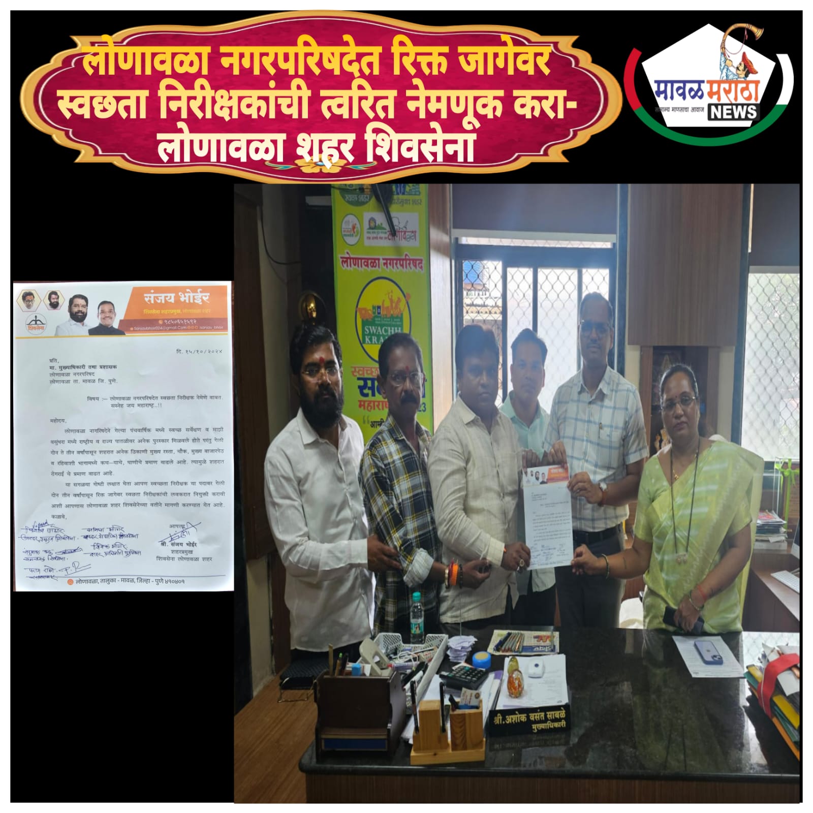 मावळ मराठा न्युज लोणावळा लोणावळा नागरिषदेने गेल्या पंचवार्षिक मध्ये स्वच्छ सर्वेक्षण व माझी वसुंधरा मध्ये राष्ट्रीय व राज्य पातळीवर अनेक पुरस्कार मिळवले होते परंतु गेली दोन ते तीन वर्षांपासून शहरात अनेक ठिकाणी मुख्य रस्ता, चौक, मुख्य बाजारपेठ व रहिवाशी भागामध्ये कचऱ्याचे, घाणीचे प्रमाण वाढले आहे त्यामुळे शहरात रोगराई चे प्रमाण वाढत आहे..या सगळ्या गोष्टी लक्षात घेता आपण स्वच्छता निरीक्षक या पदावर गेली दोन तीन वर्षांपासून रिक्त जागेवर स्वछता निरीक्षकांची लवकरात नियुक्ती करावी अशा मागणीचे निवेदन आज लोणावळा नगरपरिषदेचे मुख्याधिकारी तथा प्रशासक श्री अशोक साबळे यांना आज देण्यात आले.निवेदन देताना शिवसेना लोणावळा शहरप्रमुख संजय भोईर, उपशहर प्रमुख विशाल पाठारे, महिला आघाडी शहर संघटिका मनीषाताई भांगरे, शहर समन्व्यक नंदूभाऊ कडू, युवासेना शहर युवा अधिकारी विवेक भांगरे व सल्लागार पराग राणे उपस्थित होते.