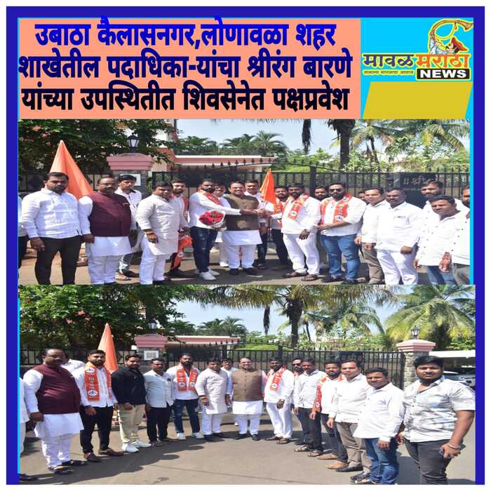 मावळ मराठा न्युज :- लोणावळा,उबाठा कैलासनगर, लोणावळा शहर शाखेतील पदाधिका-यांचा महासंसद रत्न खासदार श्रीरंग आप्पा बारणे यांच्या उपस्थितीत व शिवसेना लोणावळा शहरप्रमुख संजय भोईर यांच्या नेतृत्वाखाली शिवसेना पक्ष प्रवेश करण्यात आला.कैलास नगर उबाठा शाखाप्रमुख विनायक भानुदास शिंदे, उपशाखाप्रमुख साईनाथ भानुदास शिंदे, शिवसैनिक अमोल दौलत बामणे,शुभम अनिल तिकोने अविनाश चंद्रकांत शिंदे, ओमकार बोडके,, केतन फाटक,श्रवण वाळंज,महेश कांबळे,ओमकार माने, रोहित नागोरे, अनिल बामणे, अनुज साळवे,कैलासनगर उबाठा शाखेतील सर्व पदाधिकारी व शिवसैनिकांचा प्रवेश शिवसेना जिल्हाप्रमुख बाळासाहेब,वाल्हेकर, उपजिल्हाप्रमुख दिलीपशेठ पांढरकर,युवासेना जिल्हा pप्रमुख राजेंद्र तरस, उपतालुका प्रमुख राम सावंत, युवासेना पिंपरी चिंचवड शहरप्रमुख माऊली जगताप,तळेगाव शहरप्रमुख देवा खरटमल, उपशहर प्रमुख विशाल पाठारे,उद्योजक नवनाथ हरपुढे, उपविभागप्रमुख नरेश घोलप,विभागप्रमुख दत्ता चोरघे आदी शिवसेना युवासेना पदाधिकाऱ्यांच्या उपस्थितीत संपन्न झाला.