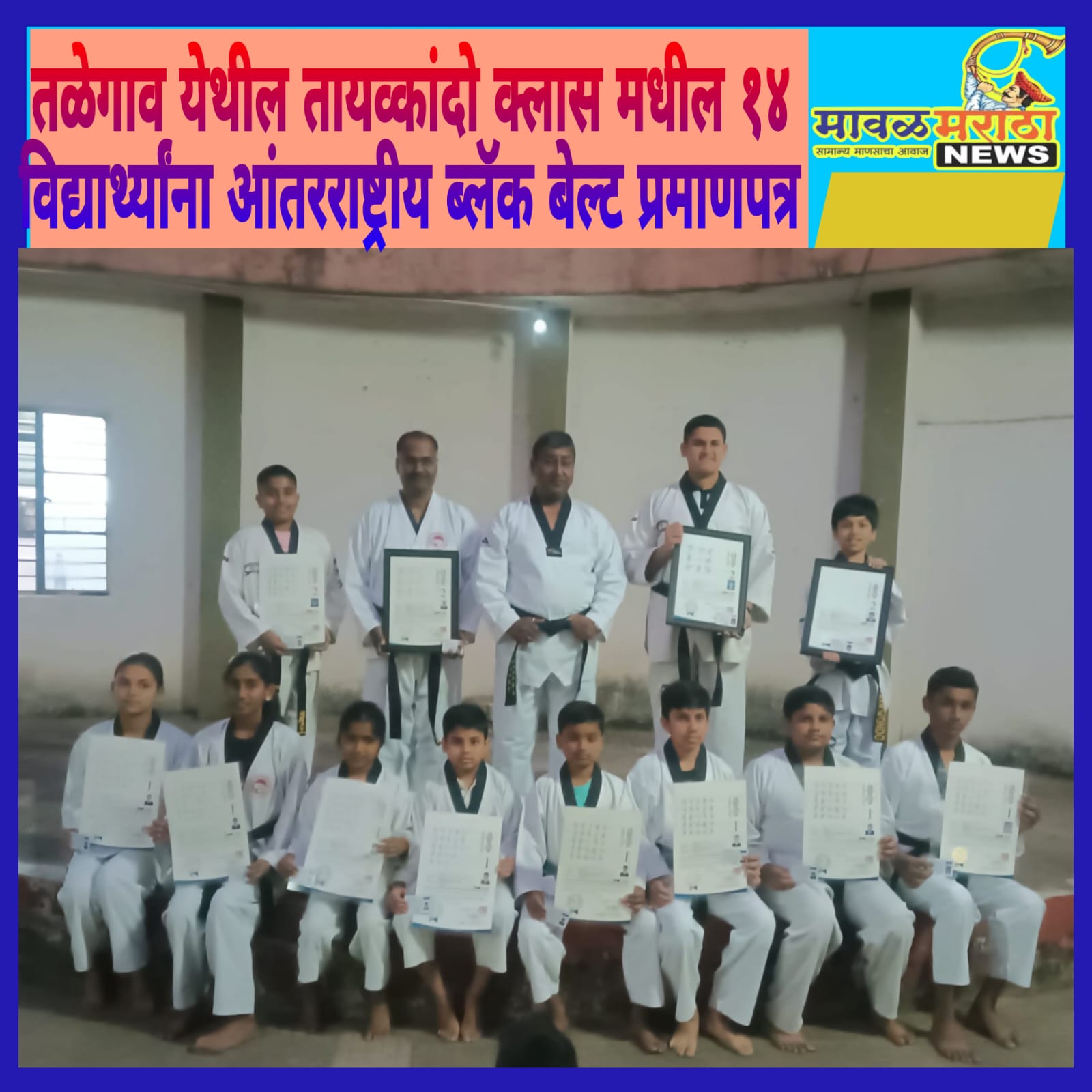 तळेगाव येथील तायव्कांदो क्लास मधील १४ विद्यार्थ्यांना आंतरराष्ट्रीय ब्लॅक बेल्ट प्रमाणपत्र