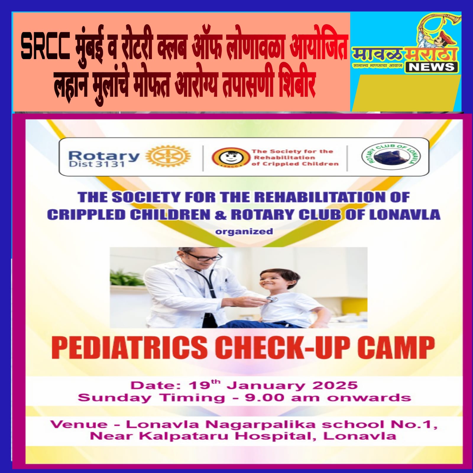 मावळ मराठा न्युज – लोणावळा, वार रविवार दि. १९ जानेवारी २०२५ रोजी सकाळी ९ .०० वाजताशिवदुर्ग हॉल,प्रियदर्शनी संकूल,जैन मंदिरा शेजारी , गावठाण,लोणावळा येथे लहान मुलांचे मोफत आरोग्य तपासणी शिबीर आयोजित केले आहे.या शिबीरात मुंबई हून येणाऱ्या प्रत्येक गोष्टीमधील तज्ञ डॉक्टरांकडून लहान मुलांच्या बाबतीतील खालील लक्षणांची तपासणी करून त्यावर पुढील उपचार सुचवले जाणार आहेत. यात १ . चालण्यात असंतूलन२ . अवयवांचे विकार३ . स्नायुंचे विकार४ . हाडांना झालेली दुखापत५ . सेरेबल पाल्सी६ . पाठीच्या कण्याचे विकार७ . स्वमग्नता८ . अतिचंचलता९ . फिट / झटके येणे, शुद्ध हरपणे१० . स्नायुंचे आखडणे११ . शिक्षकण्यातील अक्षमता१२ . अनुवांशिक विकार१३ . भौतीक उपचार१४ . स्पीच थेरपी१५ . मानसशास्त्र व वर्तणूक थेरपी१६ . नजरेतील दोष या सर्व आजारांची मोफत तपासणी केली जाणार आहे. त्यामुळे आपल्या अंगणवाडी / बालवाडी / नर्सरी /शाळेतील विद्यार्थी , आपली अथवा आपल्या परिचीत कोणी मुले असल्यास या विनामुल्य शिबीराचा त्यांनी अवश्य लाभ घ्यावा असे आवाहन रोटरी क्लब कडून करण्यात आले आहे.त्यासाठी खालील नंबर वर संपर्क करा.संपर्कआनंद गावडे-(सर)८८०६८८८८०५ , ८८८८००७५८८ आशिष मेहता-(रोटरी क्लब )-९२२६२२०१४८