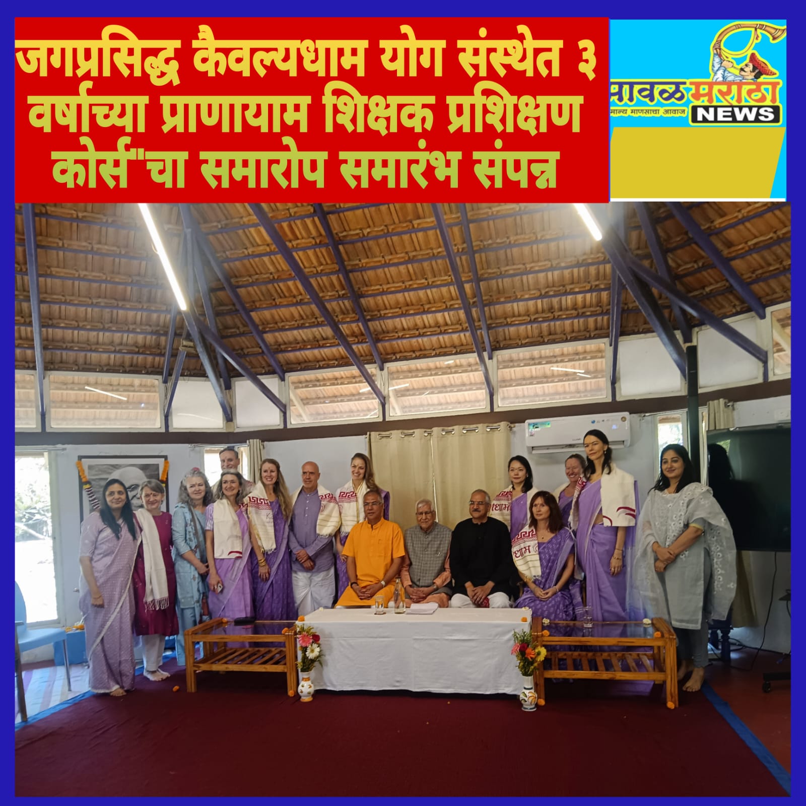 मावळ मराठा न्युज -लोणावळा,कैवल्यधाम योग संस्थेत गुरुवार दिनांक २० फेब्रुवारी २०२५ रोजी प्रामाणिक आणि वचनबध्द विद्यार्थ्यांसाठी तयार करण्यात आलेल्या ३ वर्षाच्या प्राणायाम शिक्षक प्रशिक्षण कोर्स चा समारोप समारंभ गुरुवार दिनांक २० फेब्रुवारी २०२५ रोजी कैवल्यधाम संस्थेचे अध्यक्ष डॉ. ओम प्रकाश तिवारी, संस्थेचे मानद सचिव व प्रमुख कार्यकारी अधिकारी श्री सुबोध तिवारी, तसेच कोर्सचे शिक्षक व मार्गदर्शक श्री सुधीर तिवारी यांच्या प्रमुख उपस्थितीत संस्थेच्या “मनन हॉल” मध्ये मोठ्या उत्साहात संपन्न झाला.कार्यक्रमाची सुरुवात सर्व विद्यार्थ्यांचे भारतीय परंपरेनुसार औक्षण करून शांती पाठाने करण्यात आली. सुरुवातीस श्री सुधीर तिवारी यांनी प्रास्ताविक केले. डॉ. ओम प्रकाश तिवारी यांनी आशीर्वादपर भाषण केले. उपस्थित सर्व विदेशी विद्यार्थी आपले कोर्समधील अनुभव कथन करताना भावुक झाले. कोर्स मधील सर्व विद्यार्थ्यांना उपस्थित मान्यवरांच्या हस्ते प्रमाणपत्र, शाल आणि पतंजली मुद्रा देऊन सन्मानित करण्यात आले.याप्रसंगी योग शिक्षक, प्राणायाम शिक्षक प्रशिक्षण कोर्स चे विद्यार्थी तसेच लोणावळ्यातील पत्रकार उपस्थित होते.श्री सुधीर तिवारी यांच्या मार्गदर्शनाखाली पूर्ण झालेल्या या तीन वर्षाच्या अभ्यासक्रमामध्ये विदेशातील विद्यार्थ्यांनी सहभाग घेतला होता. २०१९ साली सुरु झालेला हा कोर्स कोव्हीड च्या काळात लांबला गेला होता परंतु विदेशी विद्यार्थ्यांच्या सकारात्मक प्रतिसादामुळे 2025 साली यशस्वीरीत्या पुर्ण झाला आहे.कार्यक्रमाचे सूत्रसंचालन कोर्सच्या समन्वयक श्रीमती शालिनी श्रीवास्तव यांनी केले तसेच श्री सुबोध तिवारी यांनी आभार प्रदर्शन केले.हा कोर्स यशस्वीरीत्या पार पडण्यासाठी कैवल्यधाम संस्थेच्या योग शिक्षिका ईशविंदर कौर, देबश्री गांगुली यांचे विशेष सहकार्य लाभले.