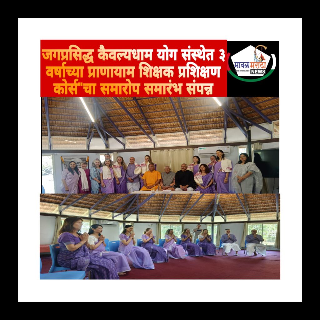 मावळ मराठा न्युज -लोणावळा,कैवल्यधाम योग संस्थेत गुरुवार दिनांक २० फेब्रुवारी २०२५ रोजी प्रामाणिक आणि वचनबध्द विद्यार्थ्यांसाठी तयार करण्यात आलेल्या ३ वर्षाच्या प्राणायाम शिक्षक प्रशिक्षण कोर्स चा समारोप समारंभ गुरुवार दिनांक २० फेब्रुवारी २०२५ रोजी कैवल्यधाम संस्थेचे अध्यक्ष डॉ. ओम प्रकाश तिवारी, संस्थेचे मानद सचिव व प्रमुख कार्यकारी अधिकारी श्री सुबोध तिवारी, तसेच कोर्सचे शिक्षक व मार्गदर्शक श्री सुधीर तिवारी यांच्या प्रमुख उपस्थितीत संस्थेच्या “मनन हॉल” मध्ये मोठ्या उत्साहात संपन्न झाला.कार्यक्रमाची सुरुवात सर्व विद्यार्थ्यांचे भारतीय परंपरेनुसार औक्षण करून शांती पाठाने करण्यात आली. सुरुवातीस श्री सुधीर तिवारी यांनी प्रास्ताविक केले. डॉ. ओम प्रकाश तिवारी यांनी आशीर्वादपर भाषण केले. उपस्थित सर्व विदेशी विद्यार्थी आपले कोर्समधील अनुभव कथन करताना भावुक झाले. कोर्स मधील सर्व विद्यार्थ्यांना उपस्थित मान्यवरांच्या हस्ते प्रमाणपत्र, शाल आणि पतंजली मुद्रा देऊन सन्मानित करण्यात आले.याप्रसंगी योग शिक्षक, प्राणायाम शिक्षक प्रशिक्षण कोर्स चे विद्यार्थी तसेच लोणावळ्यातील पत्रकार उपस्थित होते.श्री सुधीर तिवारी यांच्या मार्गदर्शनाखाली पूर्ण झालेल्या या तीन वर्षाच्या अभ्यासक्रमामध्ये विदेशातील विद्यार्थ्यांनी सहभाग घेतला होता. २०१९ साली सुरु झालेला हा कोर्स कोव्हीड च्या काळात लांबला गेला होता परंतु विदेशी विद्यार्थ्यांच्या सकारात्मक प्रतिसादामुळे 2025 साली यशस्वीरीत्या पुर्ण झाला आहे.कार्यक्रमाचे सूत्रसंचालन कोर्सच्या समन्वयक श्रीमती शालिनी श्रीवास्तव यांनी केले तसेच श्री सुबोध तिवारी यांनी आभार प्रदर्शन केले.हा कोर्स यशस्वीरीत्या पार पडण्यासाठी कैवल्यधाम संस्थेच्या योग शिक्षिका ईशविंदर कौर, देबश्री गांगुली यांचे विशेष सहकार्य लाभले.