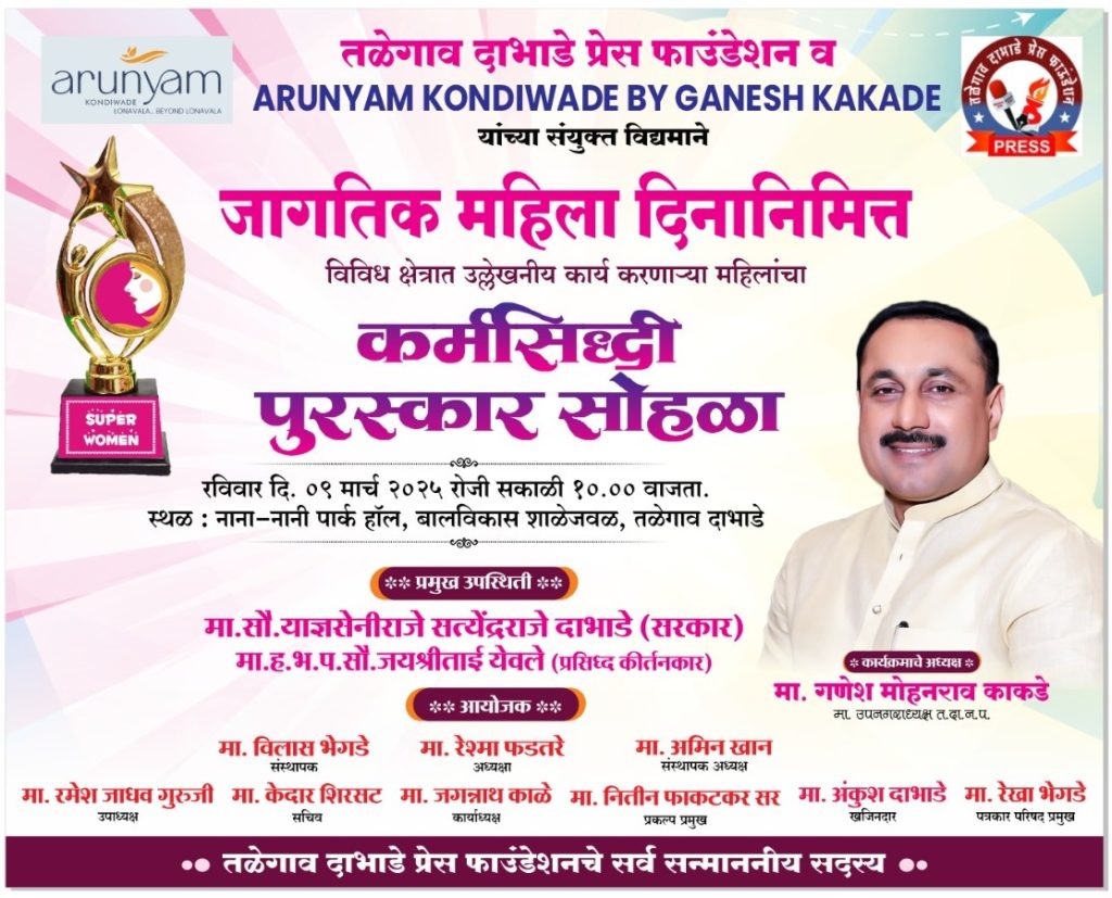तळेगाव दाभाडे प्रेस फाउंडेशन आणि अरुण्यम् कोंडीवडे यांच्या संयुक्त विद्यमाने कर्मसिद्धी पुरस्काराने होणार महिलांचा सन्मान